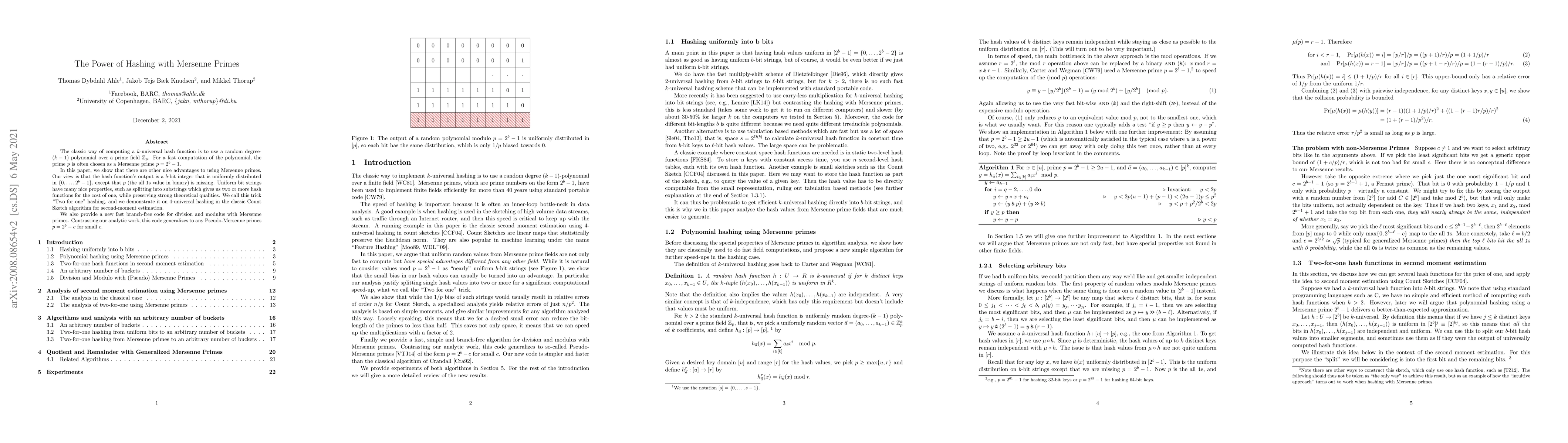 This paper explores the benefits of using Mersenne primes in $k$-universal hash functions, demonstrating "Two for one" hashing that generates multiple hash functions from a single computation. It also introduces a fast, branch-free code for division and modulus operations with Mersenne primes, extending to Pseudo-Mersenne primes.