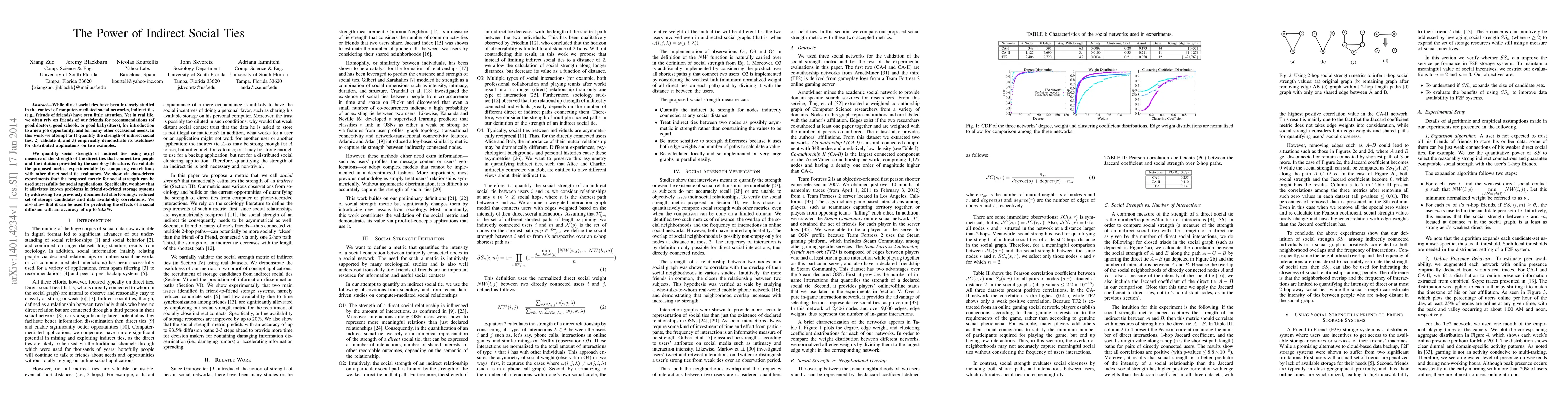 While direct social ties have been intensely studied in the context of computer-mediated social networks, indirect ties (e.g., friends of friends) have seen little attention. Yet in real life, we often rely on friends of our friends for recommendations (of good doctors, good schools, or good babysitters), for introduction to a new job opportunity, and for many other occasional needs. In this work we attempt to 1) quantify the strength of indirect social ties, 2) validate it, and 3) empirically demonstrate its usefulness for distributed applications on two examples. We quantify social strength of indirect ties using a(ny) measure of the strength of the direct ties that connect two people and the intuition provided by the sociology literature. We validate the proposed metric experimentally by comparing correlations with other direct social tie evaluators. We show via data-driven experiments that the proposed metric for social strength can be used successfully for social applications. Specifically, we show that it alleviates known problems in friend-to-friend storage systems by addressing two previously documented shortcomings: reduced set of storage candidates and data availability correlations. We also show that it can be used for predicting the effects of a social diffusion with an accuracy of up to 93.5%.