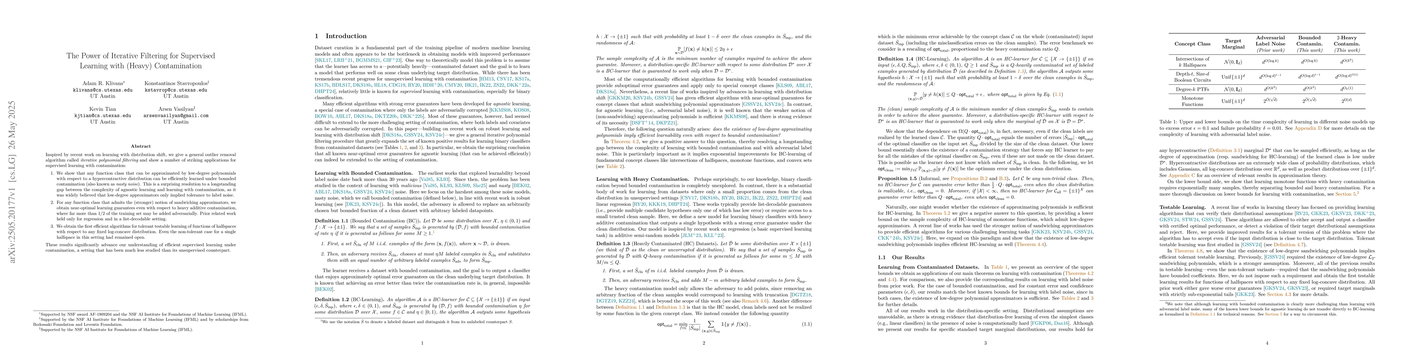 The research introduces iterative polynomial filtering, an outlier removal algorithm inspired by distribution shift work, and applies it to supervised learning with contamination.