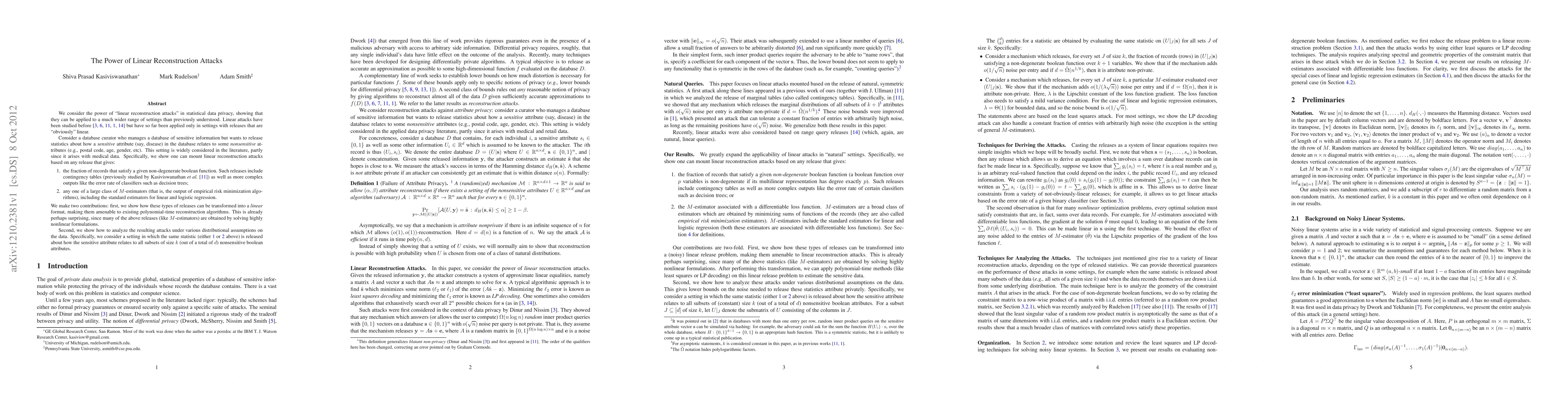 We consider the power of linear reconstruction attacks in statistical data privacy, showing that they can be applied to a much wider range of settings than previously understood. Linear attacks have been studied before (Dinur and Nissim PODS'03, Dwork, McSherry and Talwar STOC'07, Kasiviswanathan, Rudelson, Smith and Ullman STOC'10, De TCC'12, Muthukrishnan and Nikolov STOC'12) but have so far been applied only in settings with releases that are obviously linear. Consider a database curator who manages a database of sensitive information but wants to release statistics about how a sensitive attribute (say, disease) in the database relates to some nonsensitive attributes (e.g., postal code, age, gender, etc). We show one can mount linear reconstruction attacks based on any release that gives: a) the fraction of records that satisfy a given non-degenerate boolean function. Such releases include contingency tables (previously studied by Kasiviswanathan et al., STOC'10) as well as more complex outputs like the error rate of classifiers such as decision trees; b) any one of a large class of M-estimators (that is, the output of empirical risk minimization algorithms), including the standard estimators for linear and logistic regression. We make two contributions: first, we show how these types of releases can be transformed into a linear format, making them amenable to existing polynomial-time reconstruction algorithms. This is already perhaps surprising, since many of the above releases (like M-estimators) are obtained by solving highly nonlinear formulations. Second, we show how to analyze the resulting attacks under various distributional assumptions on the data. Specifically, we consider a setting in which the same statistic (either a) or b) above) is released about how the sensitive attribute relates to all subsets of size k (out of a total of d) nonsensitive boolean attributes.