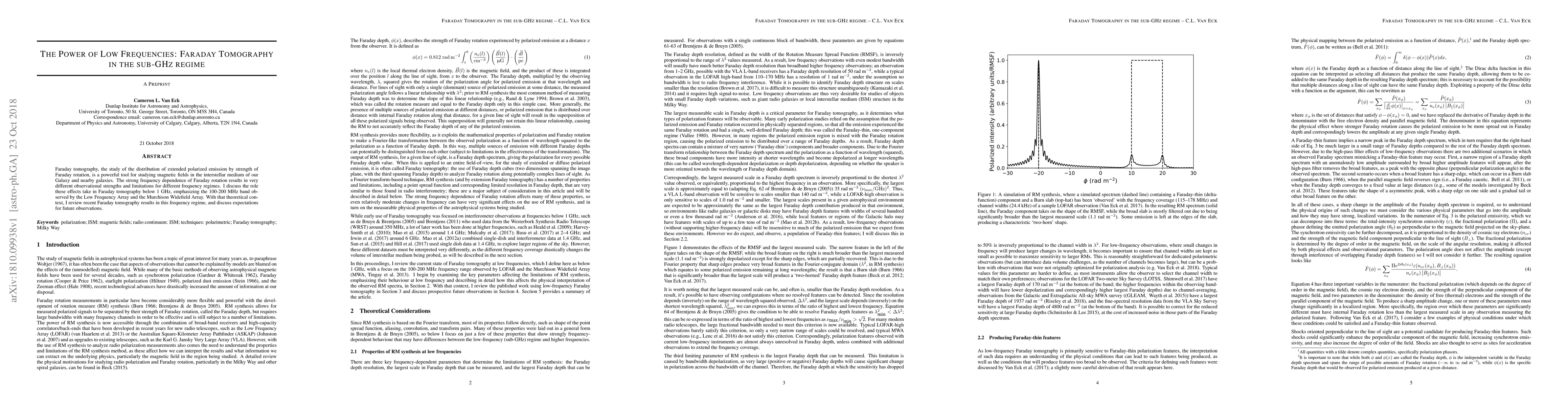 Faraday tomography, the study of the distribution of extended polarized emission by strength of Faraday rotation, is a powerful tool for studying magnetic fields in the interstellar medium of our Galaxy and nearby galaxies. The strong frequency dependence of Faraday rotation results in very different observational strengths and limitations for different frequency regimes. I discuss the role these effects take in Faraday tomography below 1 GHz, emphasizing the 100-200 MHz band observed by the Low Frequency Array and the Murchison Widefield Array. With that theoretical context, I review recent Faraday tomography results in this frequency regime, and discuss expectations for future observations.