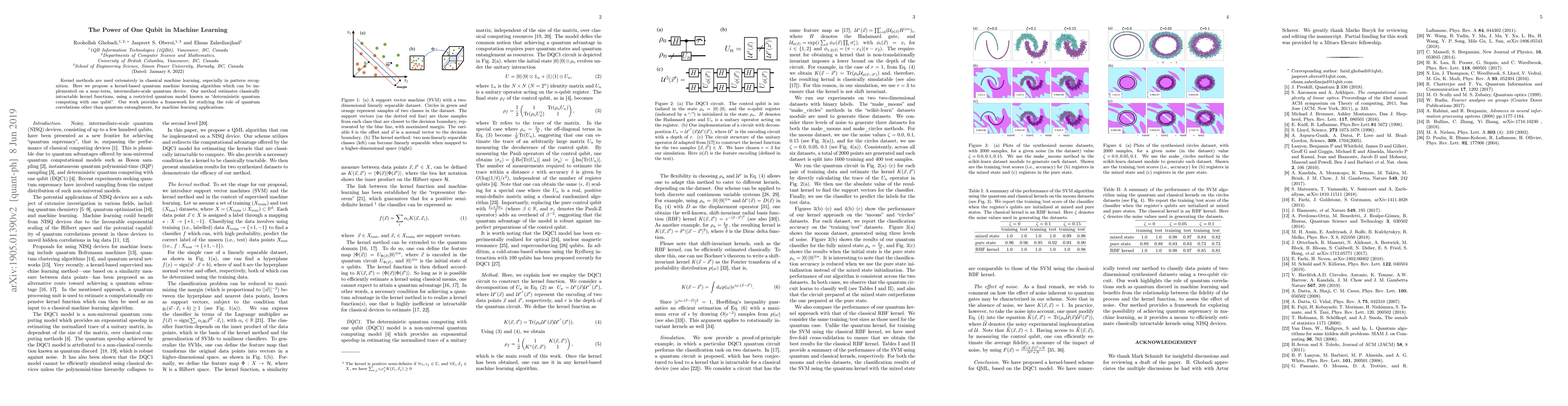 Kernel methods are used extensively in classical machine learning, especially in the field of pattern analysis. In this paper, we propose a kernel-based quantum machine learning algorithm that can be implemented on a near-term, intermediate scale quantum device. Our proposal is based on estimating classically intractable kernel functions, using a restricted quantum model known as deterministic quantum computing with one qubit. Our method provides a framework for studying the role of quantum correlations other than quantum entanglement for machine learning applications.