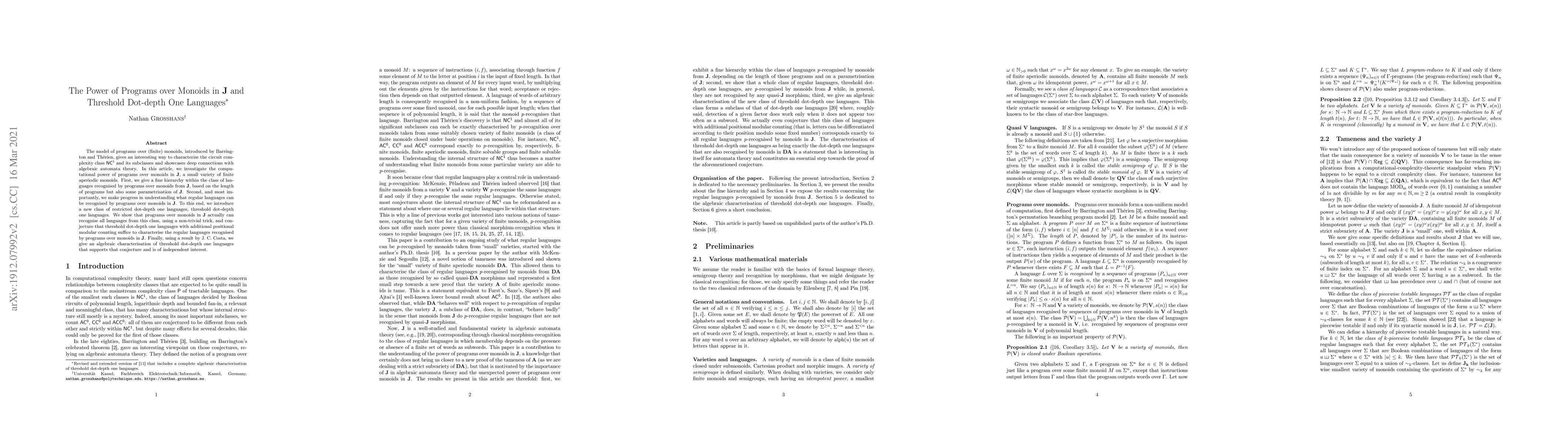 This paper explores the computational power of programs over aperiodic monoids in the variety $\mathbf{J}$, establishing a hierarchy based on program length and monoid properties. It introduces threshold dot-depth one languages and demonstrates that programs over $\mathbf{J}$ can recognize these, conjectures that they can characterize the regular languages recognized by such programs, and provides an algebraic characterization supporting this conjecture.
