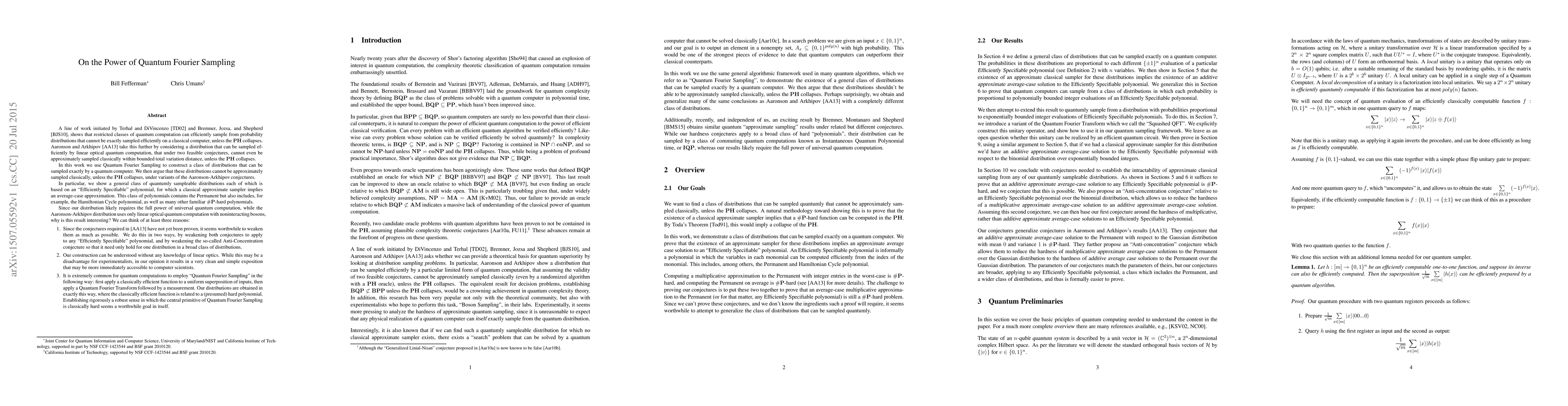 A line of work initiated by Terhal and DiVincenzo and Bremner, Jozsa, and Shepherd, shows that quantum computers can efficiently sample from probability distributions that cannot be exactly sampled efficiently on a classical computer, unless the PH collapses. Aaronson and Arkhipov take this further by considering a distribution that can be sampled efficiently by linear optical quantum computation, that under two feasible conjectures, cannot even be approximately sampled classically within bounded total variation distance, unless the PH collapses. In this work we use Quantum Fourier Sampling to construct a class of distributions that can be sampled by a quantum computer. We then argue that these distributions cannot be approximately sampled classically, unless the PH collapses, under variants of the Aaronson and Arkhipov conjectures. In particular, we show a general class of quantumly sampleable distributions each of which is based on an "Efficiently Specifiable" polynomial, for which a classical approximate sampler implies an average-case approximation. This class of polynomials contains the Permanent but also includes, for example, the Hamiltonian Cycle polynomial, and many other familiar #P-hard polynomials. Although our construction, unlike that proposed by Aaronson and Arkhipov, likely requires a universal quantum computer, we are able to use this additional power to weaken the conjectures needed to prove approximate sampling hardness results.