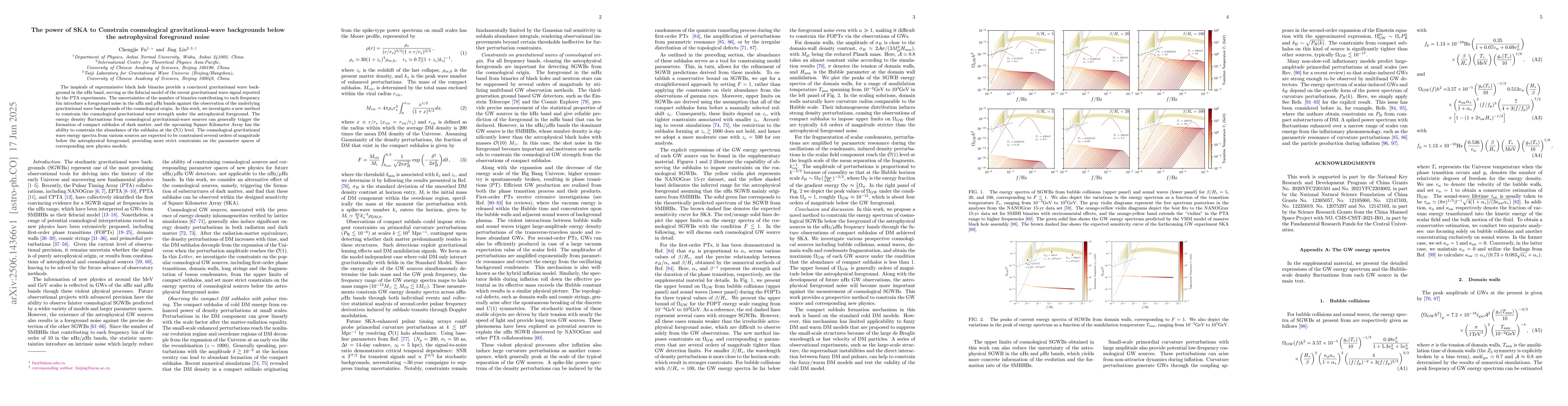 The inspirals of supermaissive black hole binaries provide a convinced gravitational wave background in the nHz band, serving as the fiducial model of the recent gravitational wave signal reported by the PTA experiments. The uncertainties of the number of binaries contributing to each frequency bin introduce a foreground noise in the nHz and $\mu$Hz bands against the observation of the underlying gravitational wave backgrounds of the cosmological origin. In this work, we investigate a new method to constrain the cosmological gravitational wave strength under the astrophysical foreground. The energy density fluctuations from cosmological gravitational-wave sources can generally trigger the formation of compact subhalos of dark matter, and the upcoming Square Kilometer Array has the ability to constrain the abundance of the subhalos at the $\mathcal{O}(1)$ level. The cosmological gravitational wave energy spectra from various sources are expected to be constrained several orders of magnitude below the astrophysical foreground, providing more strict constraints on the parameter spaces of corresponding new physics models.
