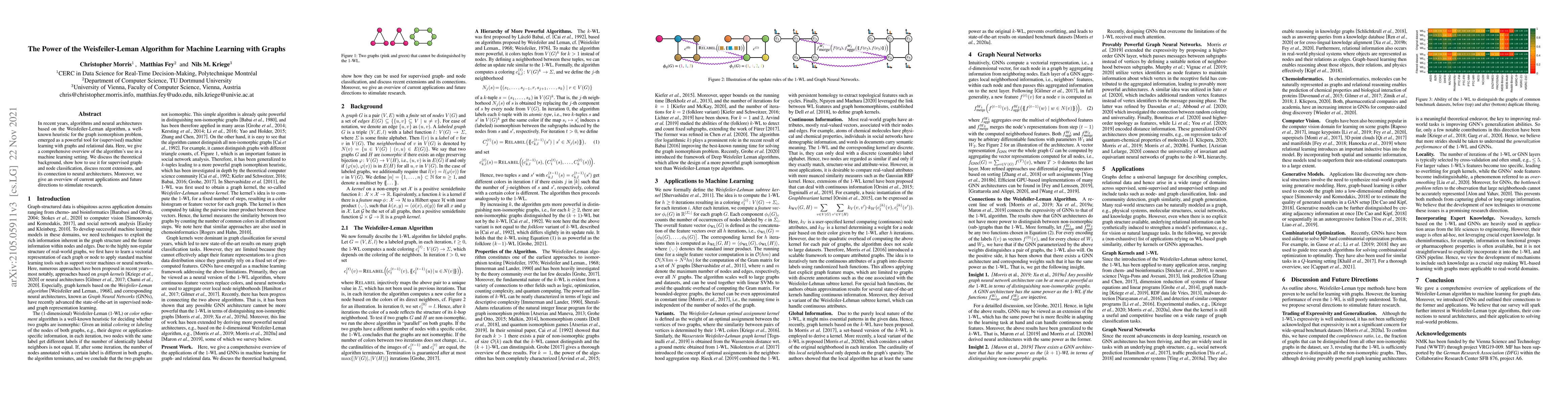The paper provides a comprehensive overview of the Weisfeiler-Leman (WL) algorithm's use in machine learning with graphs, discussing its theoretical background, applications in supervised graph- and node classification, recent extensions, and its connection to neural architectures.