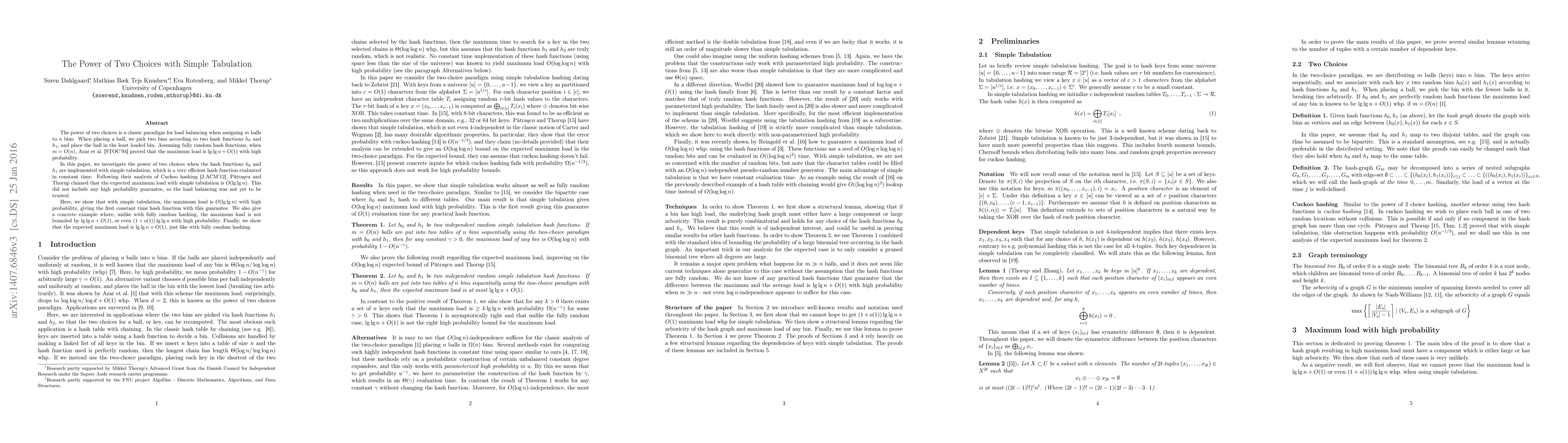 This paper investigates the load balancing efficiency of two choices with simple tabulation, proving that the maximum load is $O(\lg\lg n)$ with high probability, thus providing a constant time hash function with this guarantee. It also contrasts this with fully random hashing, showing that simple tabulation does not always achieve the same load bounds.