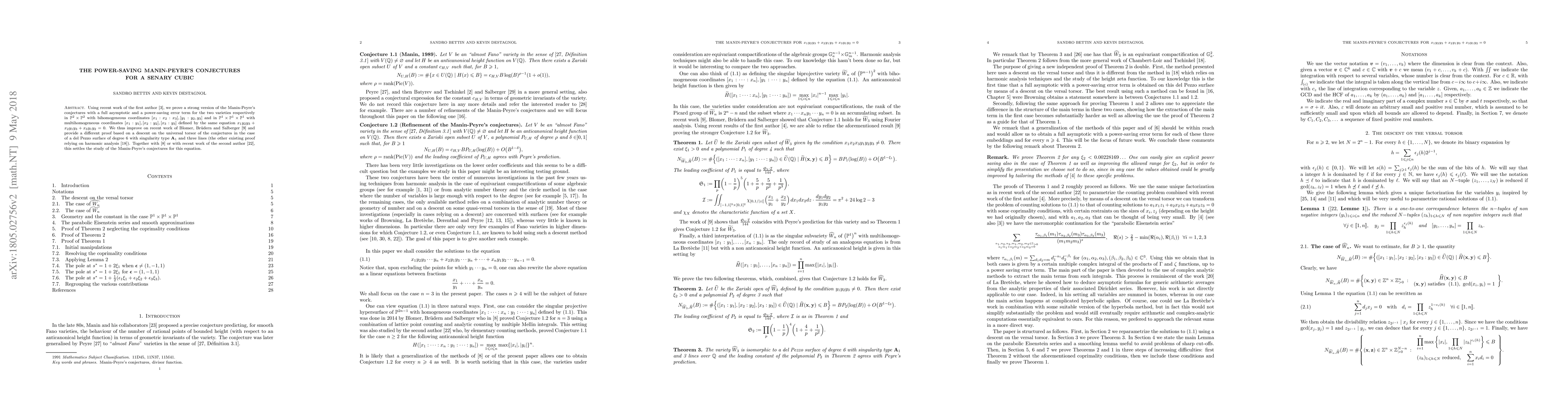 Using recent work of the first author~\cite{Bet}, we prove a strong version of the Manin-Peyre's conjectures with a full asymptotic and a power-saving error term for the two varieties respectively in $\mathbb{P}^2 \times \mathbb{P}^2$ with bihomogeneous coordinates $[x_1:x_2:x_3],[y_1:y_2,y_3]$ and in $\mathbb{P}^1\times \mathbb{P}^1 \times \mathbb{P}^1$ with multihomogeneous coordinates $[x_1:y_1],[x_2:y_2],[x_3:y_3]$ defined by the same equation $x_1y_2y_3+x_2y_1y_3+x_3y_1y_2=0$. We thus improve on recent work of Blomer, Br\"udern and Salberger \cite{BBS} and provide a different proof based on a descent on the universal torsor of the conjectures in the case of a del Pezzo surface of degree 6 with singularity type $\mathbf{A}_1$ and three lines (the other existing proof relying on harmonic analysis \cite{CLT}). Together with~\cite{Blomer2014} or with recent work of the second author \cite{Dest2}, this settles the study of the Manin-Peyre's conjectures for this equation.