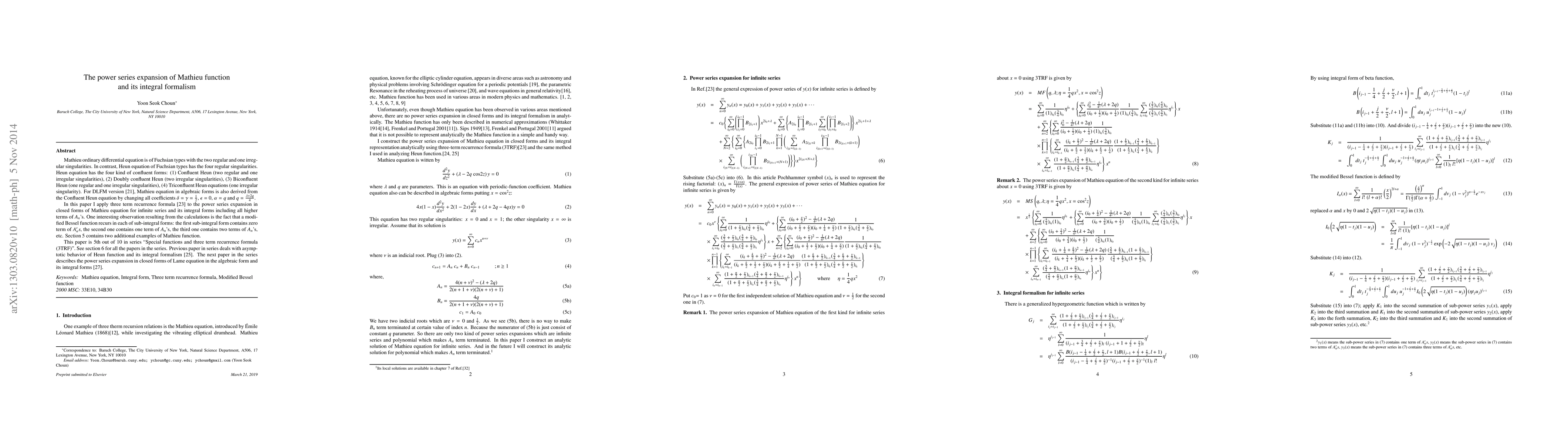 The paper presents a detailed derivation of the power series expansion and integral forms of the Mathieu function using the three-term recurrence formula, highlighting the recurrence of modified Bessel functions in sub-integral forms.