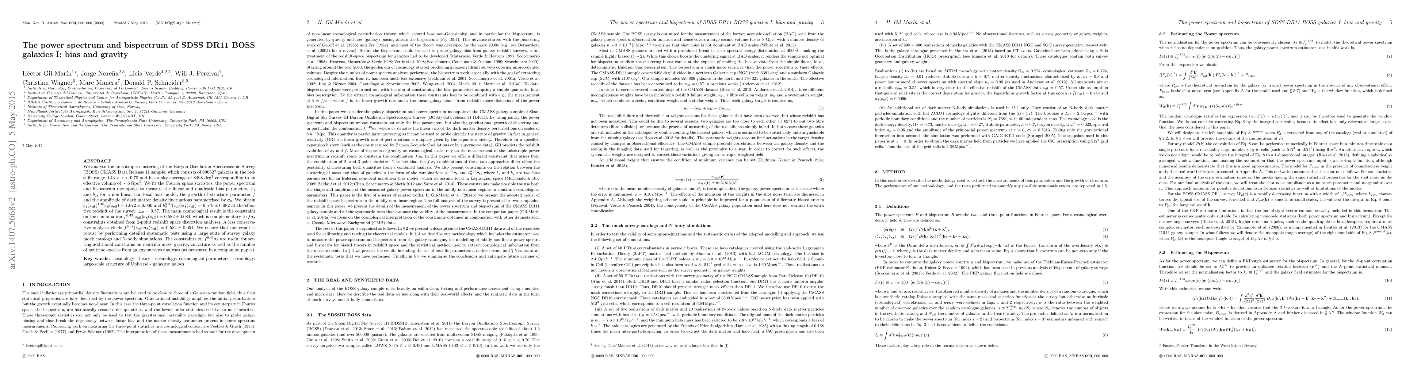 We analyse the anisotropic clustering of the Baryon Oscillation Spectroscopic Survey (BOSS) CMASS Data Release 11 sample, which consists of $690 827$ galaxies in the redshift range $0.43 < z < 0.70$ and has a sky coverage of $8 498$ deg$^2$ corresponding to an effective volume of $\sim6\,\rm{Gpc}^3$. We fit the Fourier space statistics, the power spectrum and bispectrum monopoles to measure the linear and quadratic bias parameters, $b_1$ and $b_2$, for a non-linear non-local bias model, the growth of structure parameter $f$ and the amplitude of dark matter density fluctuations parametrised by $\sigma_8$. We obtain $b_1(z_{\rm eff})^{1.40}\sigma_8(z_{\rm eff})=1.672\pm 0.060$ and $b_2^{0.30}(z_{\rm eff})\sigma_8(z_{\rm eff})=0.579\pm0.082$ at the effective redshift of the survey, $z_{\rm eff}=0.57$. The main cosmological result is the constraint on the combination $f^{0.43}(z_{\rm eff})\sigma_8(z_{\rm eff})=0.582\pm0.084$, which is complementary to $f\sigma_8$ constraints obtained from 2-point redshift space distortion analyses. A less conservative analysis yields $f^{0.43}(z_{\rm eff})\sigma_8(z_{\rm eff})=0.584\pm0.051$. We ensure that our result is robust by performing detailed systematic tests using a large suite of survey galaxy mock catalogs and N-body simulations. The constraints on $f^{0.43}\sigma_8$ are useful for setting additional constrains on neutrino mass, gravity, curvature as well as the number of neutrino species from galaxy surveys analyses (as presented in a companion paper).