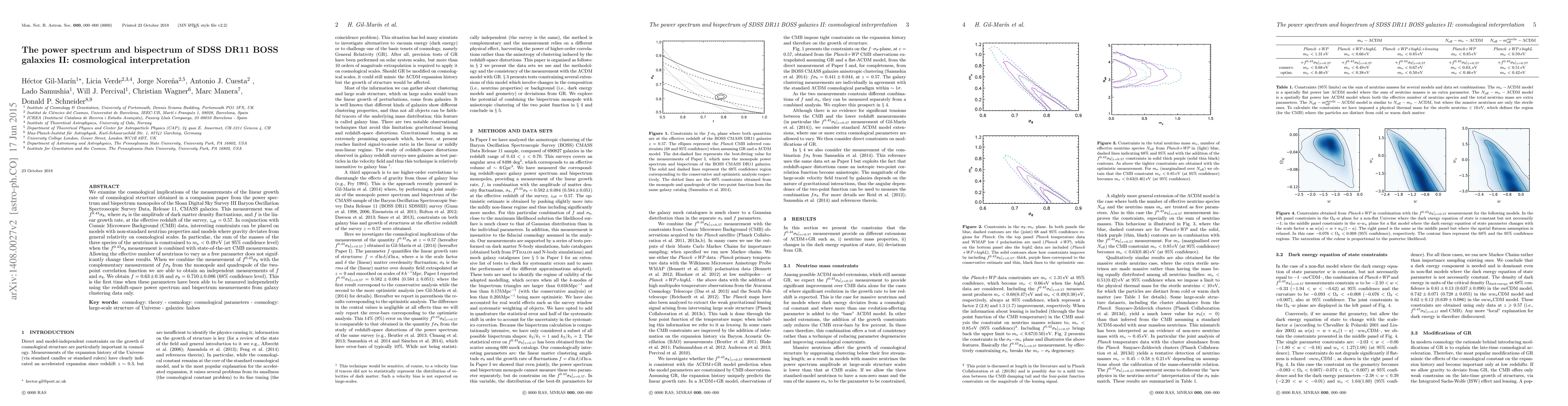 We examine the cosmological implications of the measurements of the linear growth rate of cosmological structure obtained in a companion paper from the power spectrum and bispectrum monopoles of the Sloan Digital Sky Survey III Baryon Oscillation Spectroscopic Survey Data, Release 11, CMASS galaxies. This measurement was of $f^{0.43}\sigma_8$, where $\sigma_8$ is the amplitude of dark matter density fluctuations, and $f$ is the linear growth rate, at the effective redshift of the survey, $z_{\rm eff}=0.57$. In conjunction with Cosmic Microwave Background (CMB) data, interesting constraints can be placed on models with non-standard neutrino properties and models where gravity deviates from general relativity on cosmological scales. In particular, the sum of the masses of the three species of the neutrinos is constrained to $m_\nu<0.49\,{\rm eV}$ (at 95\% confidence level) when the $f^{0.43}\sigma_8$ measurement is combined with state-of-the-art CMB measurements. Allowing the effective number of neutrinos to vary as a free parameter does not significantly change these results. When we combine the measurement of $f^{0.43}\sigma_8$ with the complementary measurement of $f\sigma_8$ from the monopole and quadrupole of the two-point correlation function we are able to obtain an independent measurements of $f$ and $\sigma_8$. We obtain $f=0.63\pm0.16$ and $\sigma_8=0.710\pm0.086$ (68\% confidence level). This is the first time when these parameters have been able to be measured independently using the redshift-space power spectrum and bispectrum measurements from galaxy clustering data only.