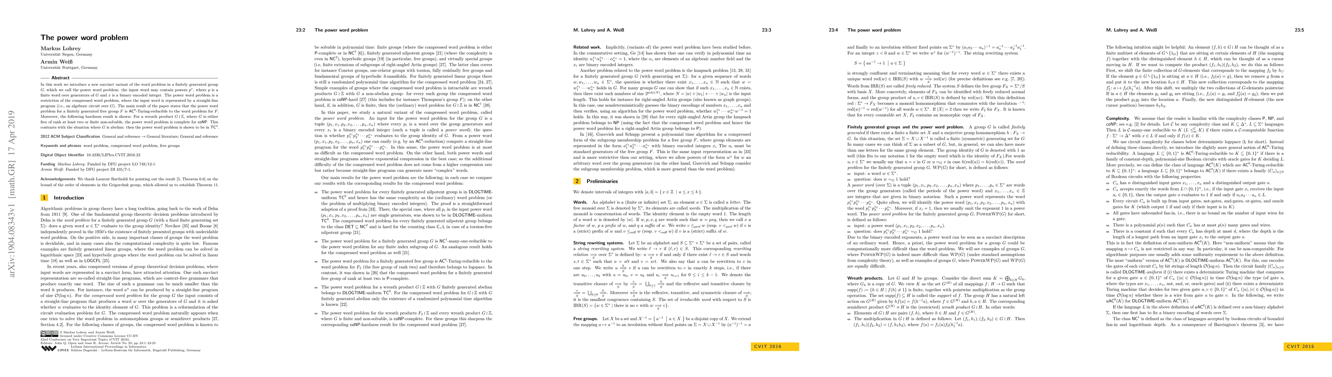 In this work we introduce a new succinct variant of the word problem in a finitely generated group $G$, which we call the power word problem: the input word may contain powers $p^x$, where $p$ is a finite word over generators of $G$ and $x$ is a binary encoded integer. The power word problem is a restriction of the compressed word problem, where the input word is represented by a straight-line program (i.e., an algebraic circuit over $G$). The main result of the paper states that the power word problem for a finitely generated free group $F$ is AC$^0$-Turing-reducible to the word problem for $F$. Moreover, the following hardness result is shown: For a wreath product $G \wr \mathbb{Z}$, where $G$ is either free of rank at least two or finite non-solvable, the power word problem is complete for coNP. This contrasts with the situation where $G$ is abelian: then the power word problem is shown to be in TC$^0$.