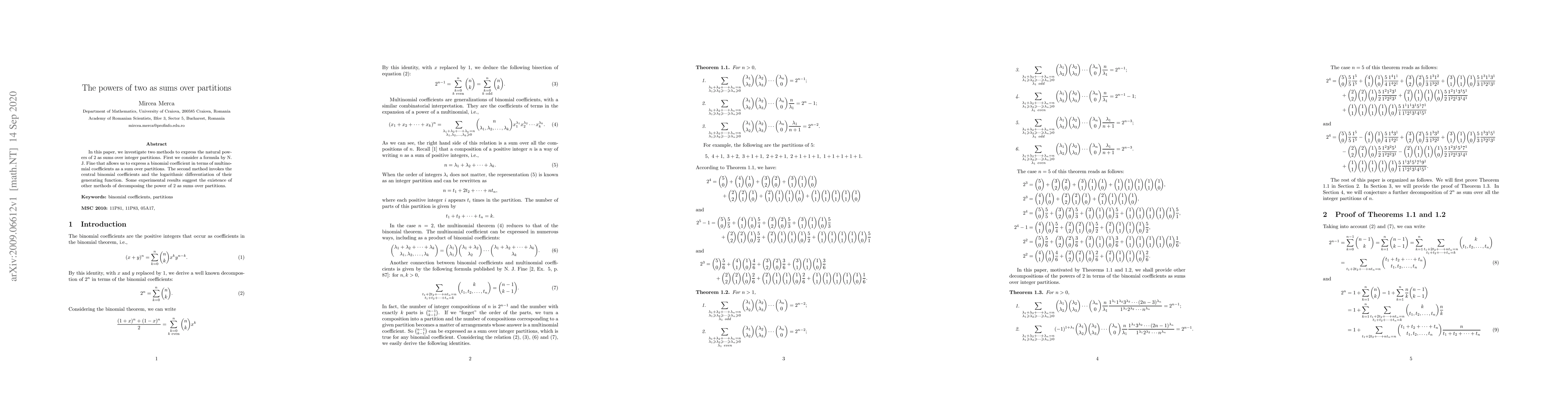 Researchers investigate two methods to express powers of 2 as sums over integer partitions, including a formula by N.J. Fine and logarithmic differentiation of generating functions, with implications for decomposing binomial coefficients.