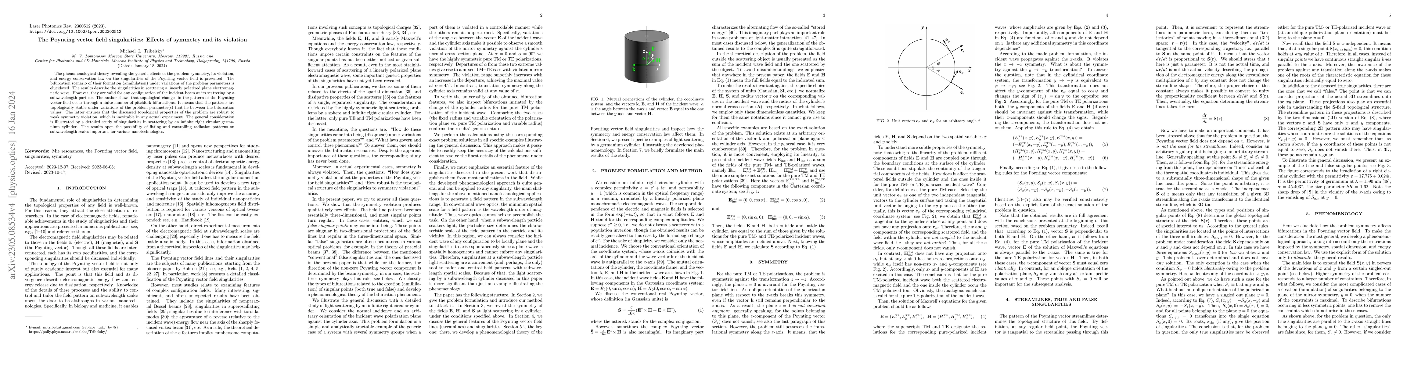 This paper investigates the effects of symmetry and its violation on the singularities of the Poynting vector field, revealing topological stability through pitchfork bifurcations. The findings, which apply to scattering scenarios involving subwavelength particles, suggest robust control over radiation patterns, crucial for nanotechnological applications.