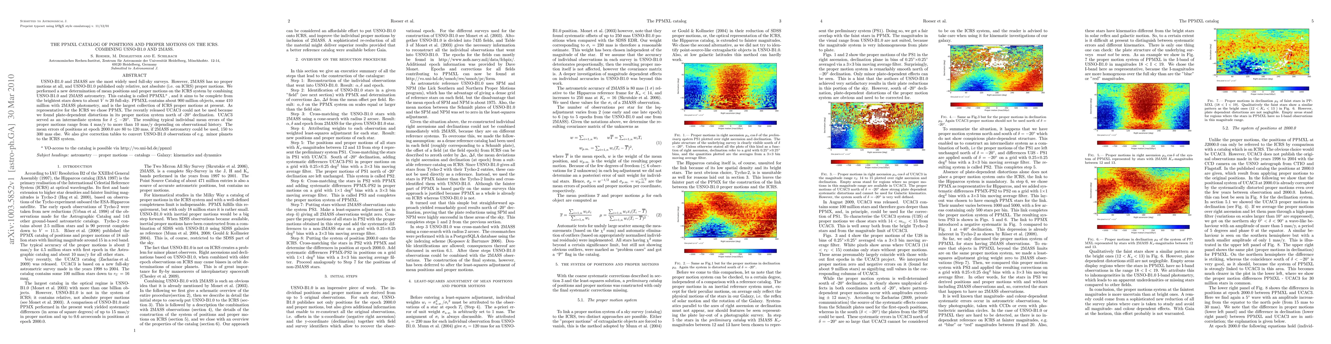 The PPMXL catalog combines USNO-B1.0 and 2MASS astrometry to provide mean positions and proper motions on the ICRS system, aiming for completeness down to $V \approx 20$. It contains about 900 million objects with typical proper motion errors ranging from 4 to over 10 mas/y.
