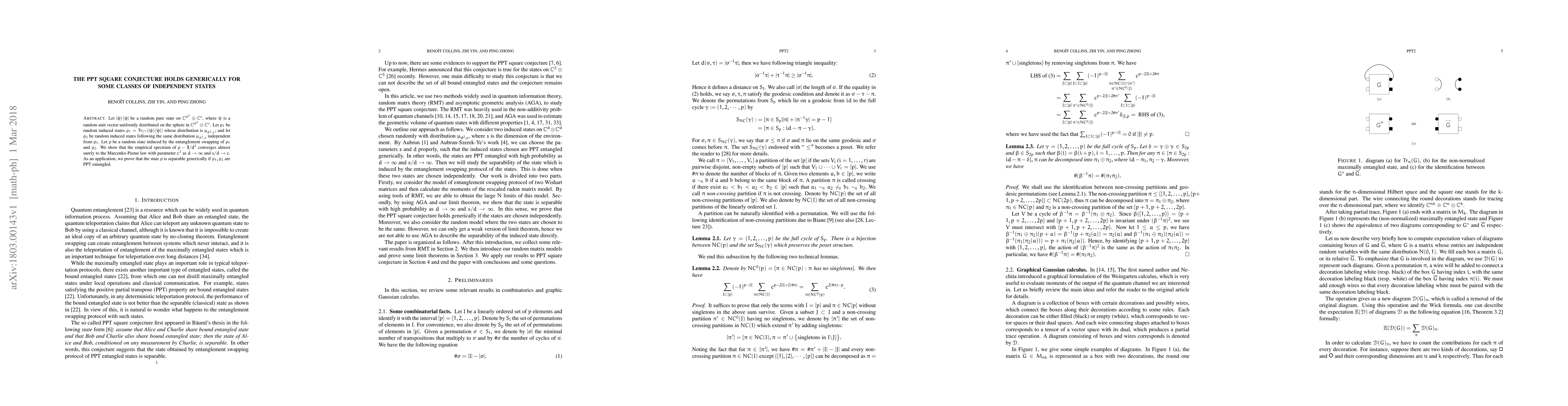 Let $|\psi\rangle\langle \psi|$ be a random pure state on $\mathbb{C}^{d^2}\otimes \mathbb{C}^s$, where $\psi$ is a random unit vector uniformly distributed on the sphere in $\mathbb{C}^{d^2}\otimes \mathbb{C}^s$. Let $\rho_1$ be random induced states $\rho_1=Tr_{\mathbb{C}^s}(|\psi\rangle\langle \psi |)$ whose distribution is $\mu_{d^2,s}$; and let $\rho_2$ be random induced states following the same distribution $\mu_{d^2,s}$ independent from $\rho_1$. Let $\rho$ be a random state induced by the entanglement swapping of $\rho_1$ and $\rho_2$. We show that the empirical spectrum of $\rho- {1\mkern -4mu{\rm l}}/d^2$ converges almost surely to the Marcenko-Pastur law with parameter $c^2$ as $d\rightarrow \infty$ and $s/d \rightarrow c$. As an application, we prove that the state $\rho$ is separable generically if $\rho_1, \rho_2$ are PPT entangled.