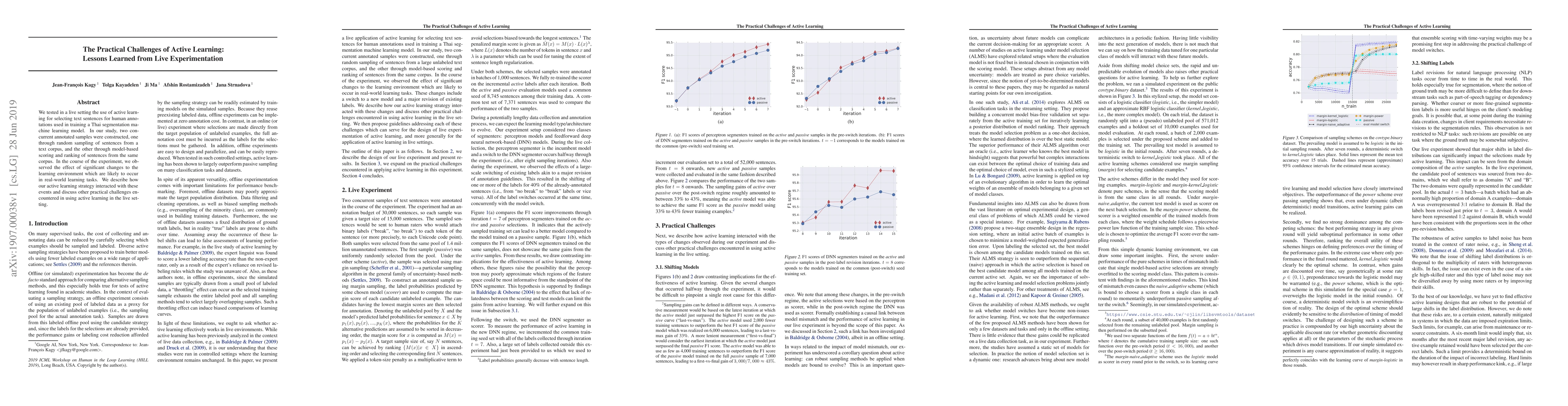 This study examines the practical challenges of active learning in a live setting by comparing random sampling and model-based scoring for selecting sentences for human annotation in a Thai segmentation machine learning model. The research highlights how real-world changes affect active learning strategies and identifies additional practical issues encountered during the experimentation process.