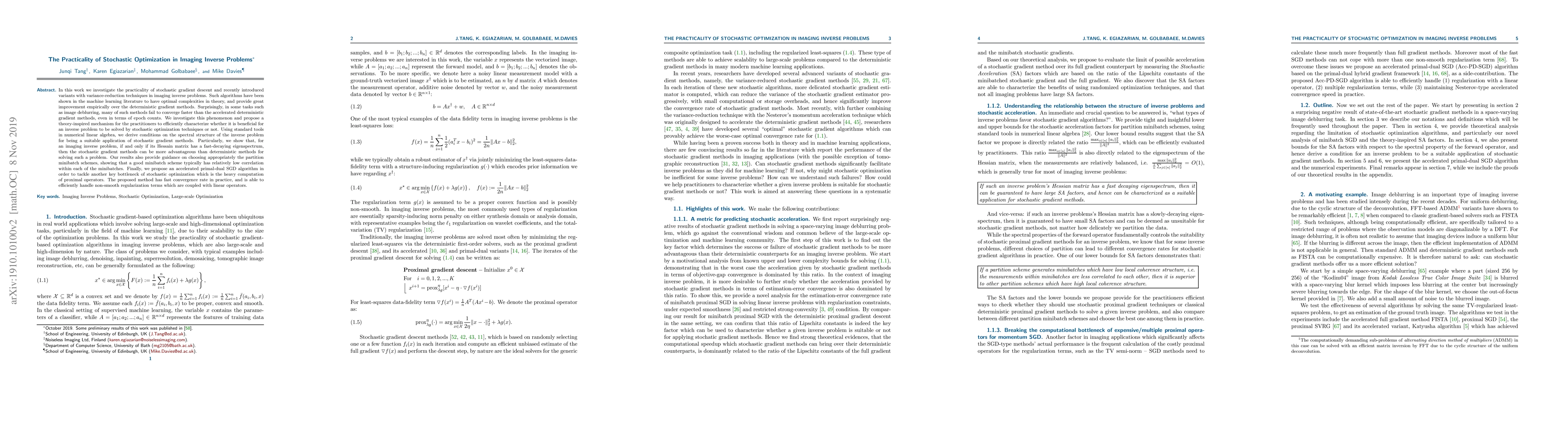 In this work we investigate the practicality of stochastic gradient descent and recently introduced variants with variance-reduction techniques in imaging inverse problems. Such algorithms have been shown in the machine learning literature to have optimal complexities in theory, and provide great improvement empirically over the deterministic gradient methods. Surprisingly, in some tasks such as image deblurring, many of such methods fail to converge faster than the accelerated deterministic gradient methods, even in terms of epoch counts. We investigate this phenomenon and propose a theory-inspired mechanism for the practitioners to efficiently characterize whether it is beneficial for an inverse problem to be solved by stochastic optimization techniques or not. Using standard tools in numerical linear algebra, we derive conditions on the spectral structure of the inverse problem for being a suitable application of stochastic gradient methods. Particularly, we show that, for an imaging inverse problem, if and only if its Hessain matrix has a fast-decaying eigenspectrum, then the stochastic gradient methods can be more advantageous than deterministic methods for solving such a problem. Our results also provide guidance on choosing appropriately the partition minibatch schemes, showing that a good minibatch scheme typically has relatively low correlation within each of the minibatches. Finally, we propose an accelerated primal-dual SGD algorithm in order to tackle another key bottleneck of stochastic optimization which is the heavy computation of proximal operators. The proposed method has fast convergence rate in practice, and is able to efficiently handle non-smooth regularization terms which are coupled with linear operators.