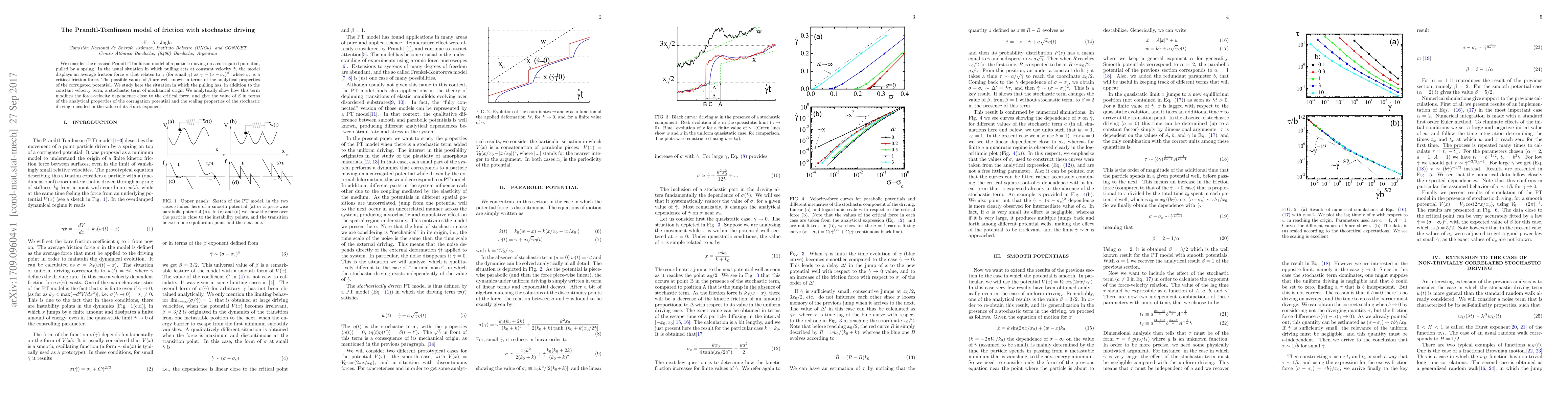 This paper investigates the Prandtl-Tomlinson model of friction under stochastic driving, showing how a stochastic term modifies the friction force-velocity relationship near the critical friction force. The analytical results provide a value for the exponent β in terms of the potential's properties and the Hurst exponent of the stochastic driving.