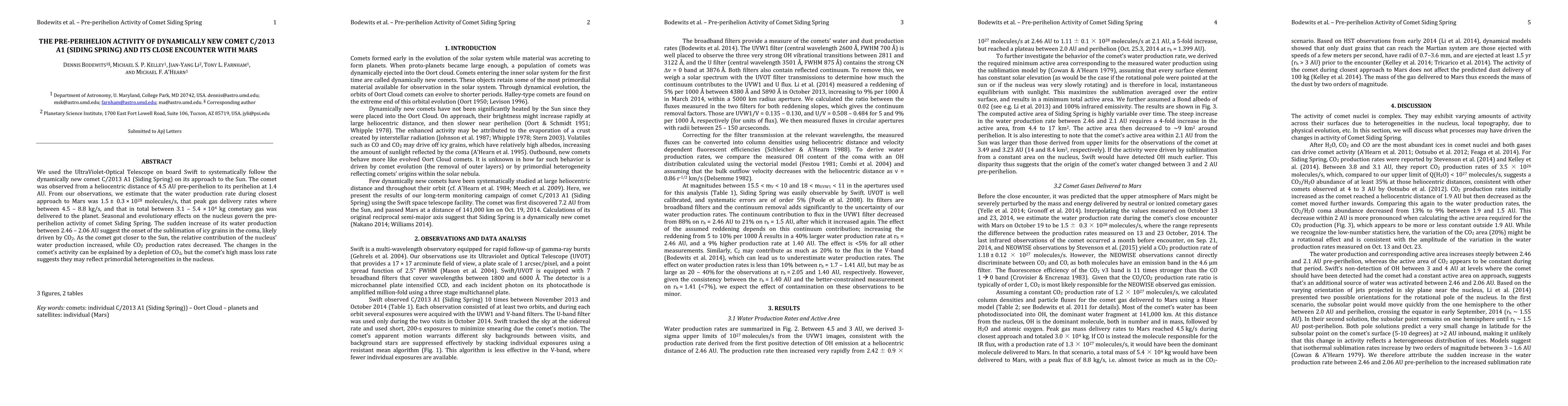 This study used the Swift satellite's UltraViolet-Optical Telescope to monitor comet C/2013 A1 (Siding Spring) from 4.5 AU pre-perihelion to perihelion at 1.4 AU, estimating its water production rate and gas delivery to Mars. Seasonal and evolutionary factors influence its activity, with CO2 sublimation onset driving the increase in water production.