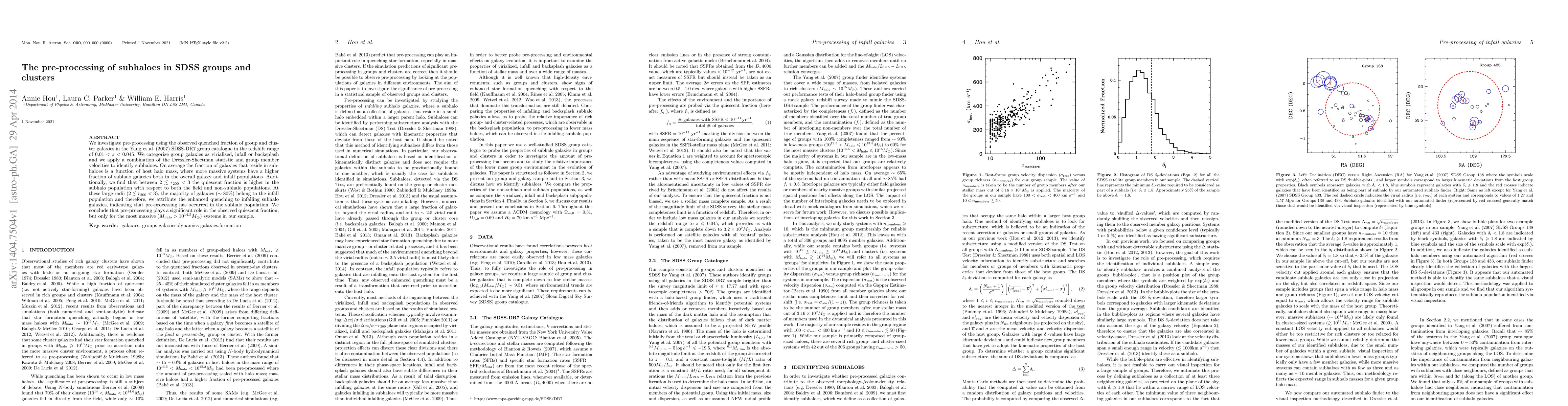 The research examines pre-processing in SDSS groups and clusters by categorizing galaxies as virialized, infall, or backsplash. Utilizing the Dressler-Shectman statistic and member velocities, they find a higher quiescent fraction in subhaloes, especially in massive systems (M_halo > 10^14.5 M_sun) at large radii (2 < r_200 < 3). This indicates infalling subhalo galaxies undergo significant quenching, highlighting pre-processing's role in massive systems.