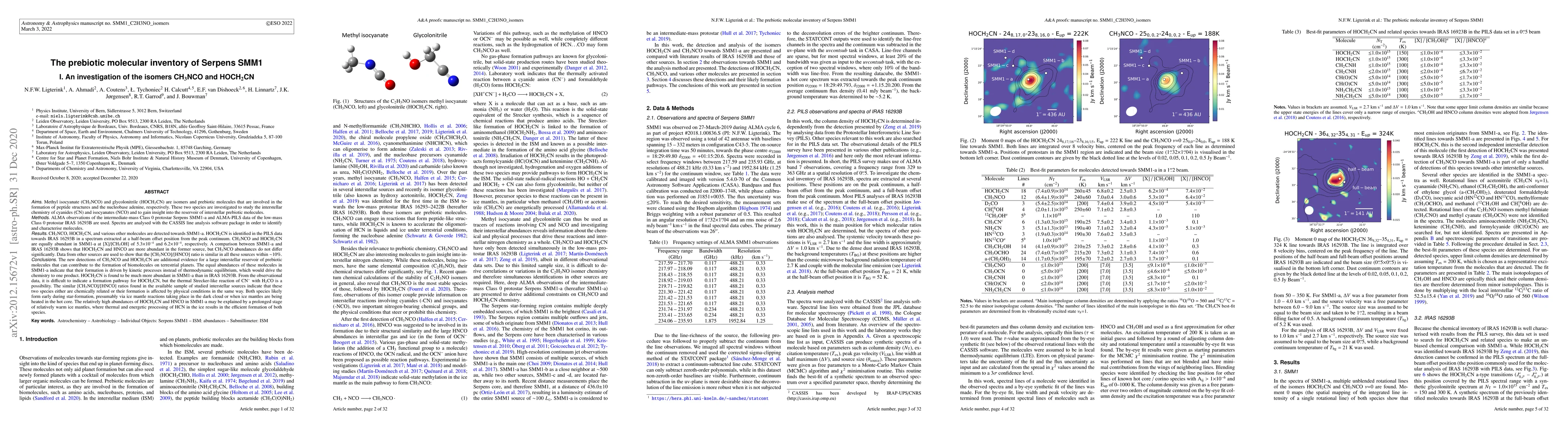 Methyl isocyanate (CH$_{3}$NCO) and glycolonitrile (HOCH$_{2}$CN) are isomers and prebiotic molecules that are involved in the formation of peptide structures and the nucleobase adenine, respectively. ALMA observations of the intermediate-mass Class 0 protostar Serpens SMM1-a and ALMA-PILS data of the low-mass Class 0 protostar IRAS~16293B are used. Spectra are analysed with the CASSIS line analysis software package in order to identify and characterise molecules. CH$_{3}$NCO, HOCH$_{2}$CN, and various other molecules are detected towards SMM1-a. HOCH$_{2}$CN is identified in the PILS data towards IRAS~16293B in a spectrum extracted at a half-beam offset position from the peak continuum. CH$_{3}$NCO and HOCH$_{2}$CN are equally abundant in SMM1-a at [X]/[CH$_{3}$OH] of 5.3$\times$10$^{-4}$ and 6.2$\times$10$^{-4}$, respectively. A comparison between SMM1-a and IRAS~16293B shows that HOCH$_{2}$CN and HNCO are more abundant in the former source, but CH$_{3}$NCO abundances do not differ significantly. Data from other sources are used to show that the [CH$_{3}$NCO]/[HNCO] ratio is similar in all these sources within $\sim$10\%. The new detections of CH$_{3}$NCO and HOCH$_{2}$CN are additional evidence for a large interstellar reservoir of prebiotic molecules that can contribute to the formation of biomolecules on terrestrial planets. A plausible formation pathway for HOCH$_{2}$CN is the thermal Strecker-like reaction of CN$^{-}$ with H$_{2}$CO. The similar [CH$_{3}$NCO]/[HNCO] ratios indicate that these two species either are chemically related or their formation is affected by physical conditions in the same way. The relatively high abundances of HOCH$_{2}$CN and HNCO in SMM1-a may be explained by a prolonged stage of relatively warm ice mantles, where thermal and energetic processing of HCN in the ice results in the efficient formation of both species.