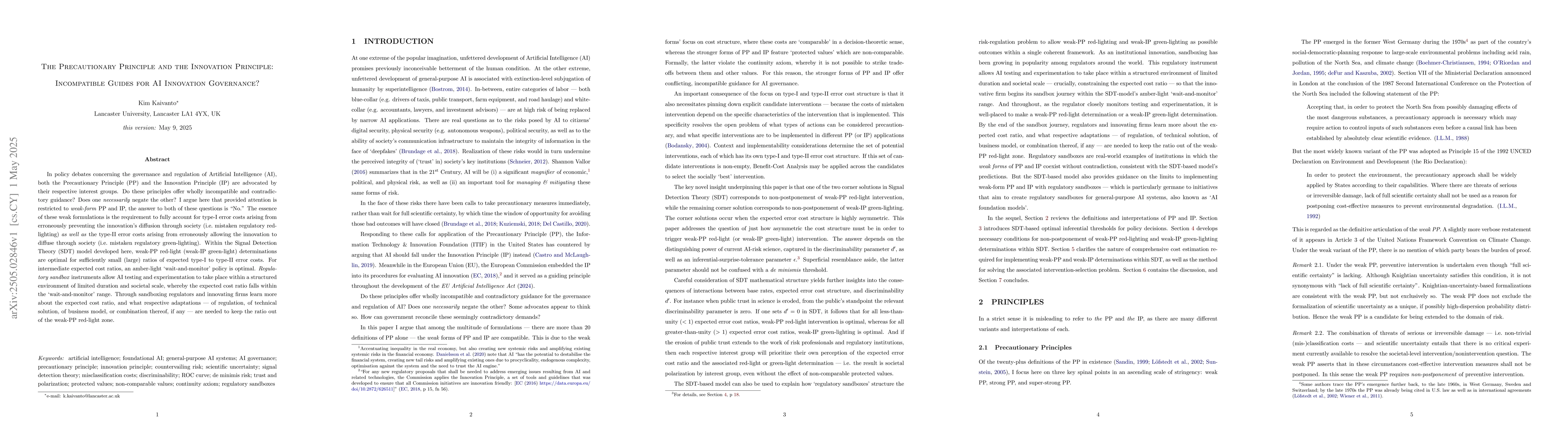 The Precautionary Principle and Innovation Principle may offer compatible guidance for AI governance when considering type-I and type-II error costs, with regulatory sandbox instruments helping to optimize risk assessment and adaptation.