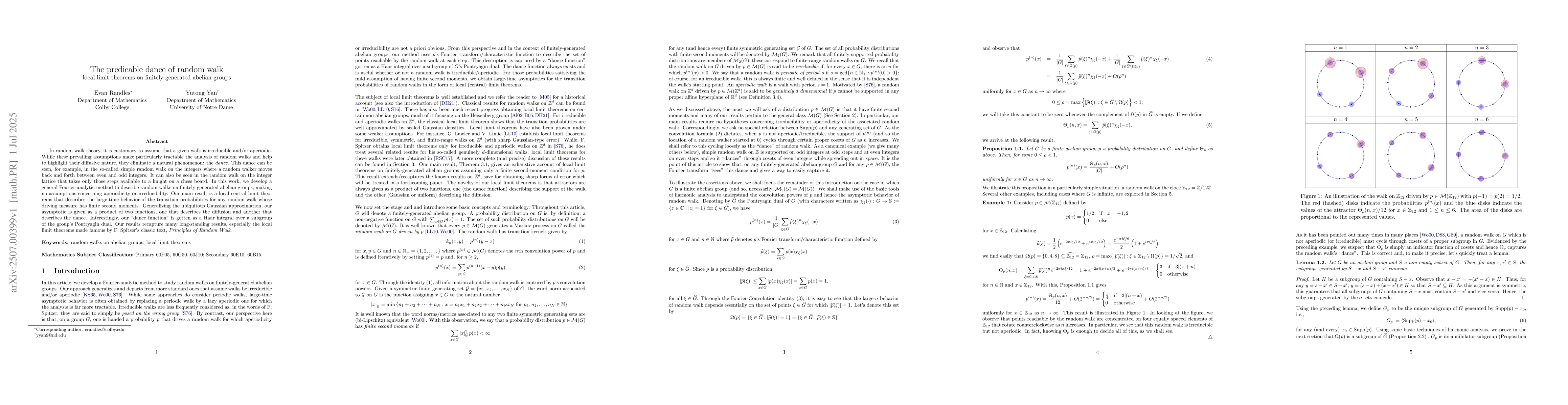 In random walk theory, it is customary to assume that a given walk is irreducible and/or aperiodic. While these prevailing assumptions make particularly tractable the analysis of random walks and help to highlight their diffusive nature, they eliminate a natural phenomenon: the dance. This dance can be seen, for example, in the so-called simple random walk on the integers where a random walker moves back and forth between even and odd integers. It can also be seen in the random walk on the integer lattice that takes only those steps available to a knight on a chess board. In this work, we develop a general Fourier-analytic method to describe random walks on finitely-generated abelian groups, making no assumptions concerning aperiodicity or irreducibility. Our main result is a local central limit theorems that describes the large-time behavior of the transition probabilities for any random walk whose driving measure has finite second moments. Generalizing the ubiquitous Gaussian approximation, our asymptotic is given as a product of two functions, one that describes the diffusion and another that describes the dance. Interestingly, our ``dance function" is gotten as a Haar integral over a subgroup of the group's Pontryagin dual. Our results recapture many long-standing results, especially the local limit theorems made famous by F. Spitzer's classic text, Principles of Random Walk.