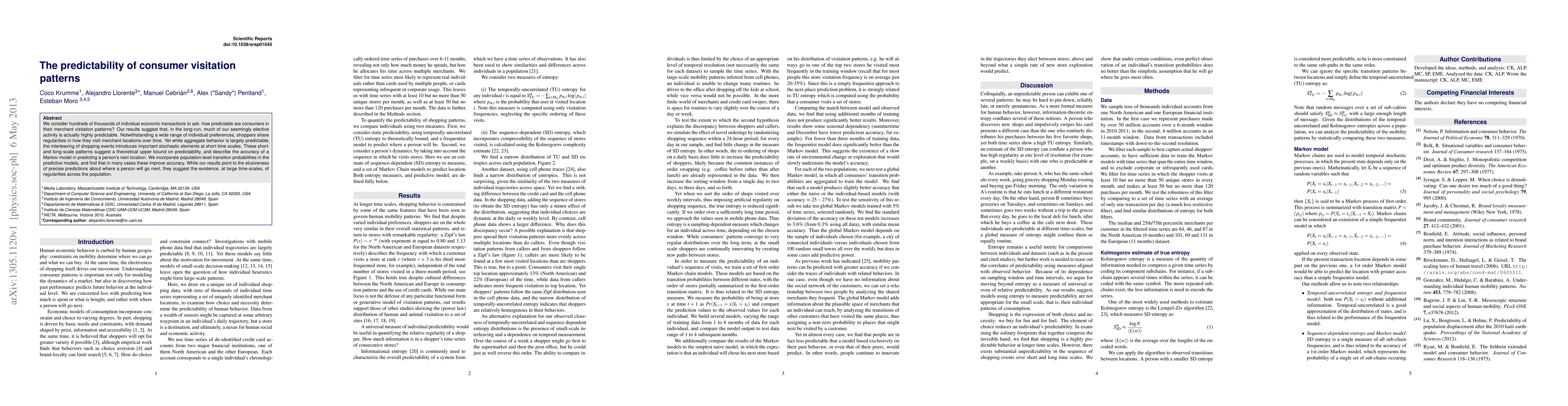 Consumer visitation patterns show regularities across time, with aggregate behavior largely predictable but short-term events introducing randomness. A Markov model improves accuracy when incorporating population-level transition probabilities.