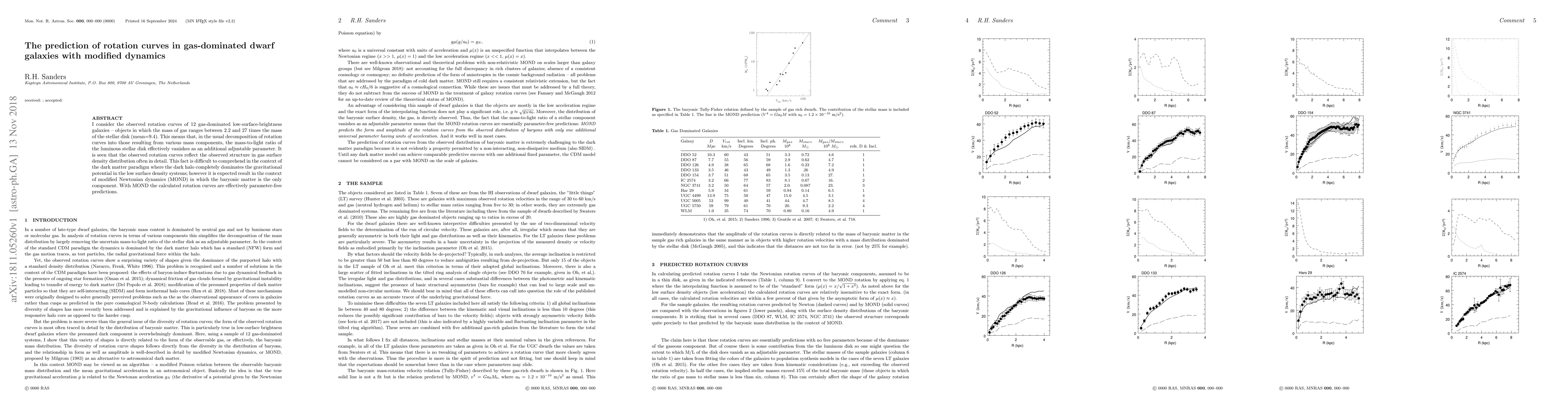 This paper examines the rotation curves of 12 gas-dominated dwarf galaxies, finding that their observed curves closely match gas density distributions, challenging the dark matter paradigm but aligning with modified Newtonian dynamics (MOND) predictions where baryonic matter dominates. MOND allows for parameter-free calculations of these curves.