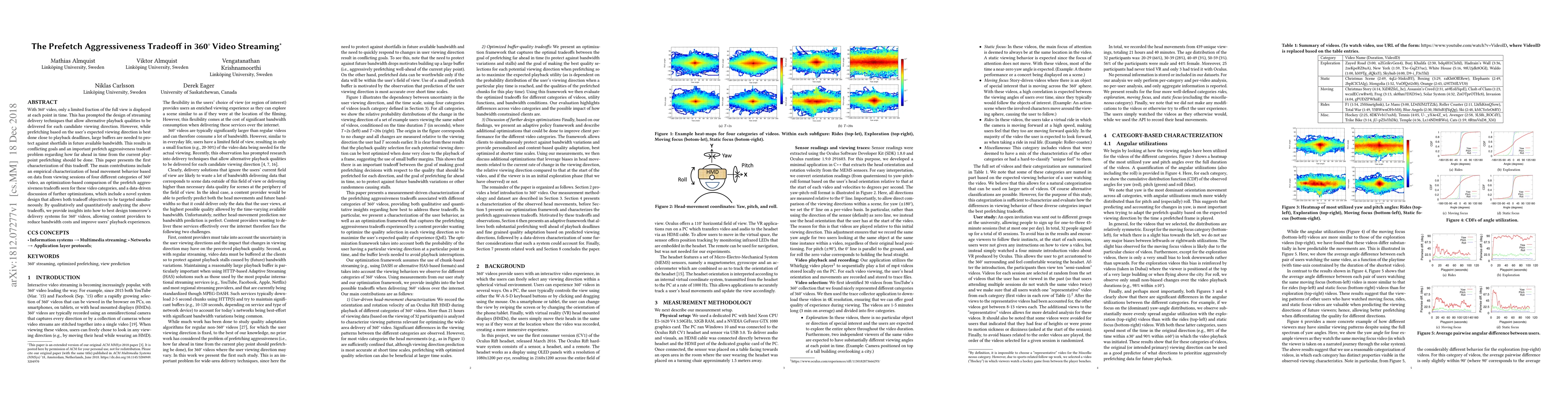 With 360$^{\circ}$ video, only a limited fraction of the full view is displayed at each point in time. This has prompted the design of streaming delivery techniques that allow alternative playback qualities to be delivered for each candidate viewing direction. However, while prefetching based on the user's expected viewing direction is best done close to playback deadlines, large buffers are needed to protect against shortfalls in future available bandwidth. This results in conflicting goals and an important prefetch aggressiveness tradeoff problem regarding how far ahead in time from the current playpoint prefetching should be done. This paper presents the first characterization of this tradeoff. The main contributions include an empirical characterization of head movement behavior based on data from viewing sessions of four different categories of 360$^{\circ}$ video, an optimization-based comparison of the prefetch aggressiveness tradeoffs seen for these video categories, and a data-driven discussion of further optimizations, which include a novel system design that allows both tradeoff objectives to be targeted simultaneously. By qualitatively and quantitatively analyzing the above tradeoffs, we provide insights into how to best design tomorrow's delivery systems for 360$^{\circ}$ videos, allowing content providers to reduce bandwidth costs and improve users' playback experiences.