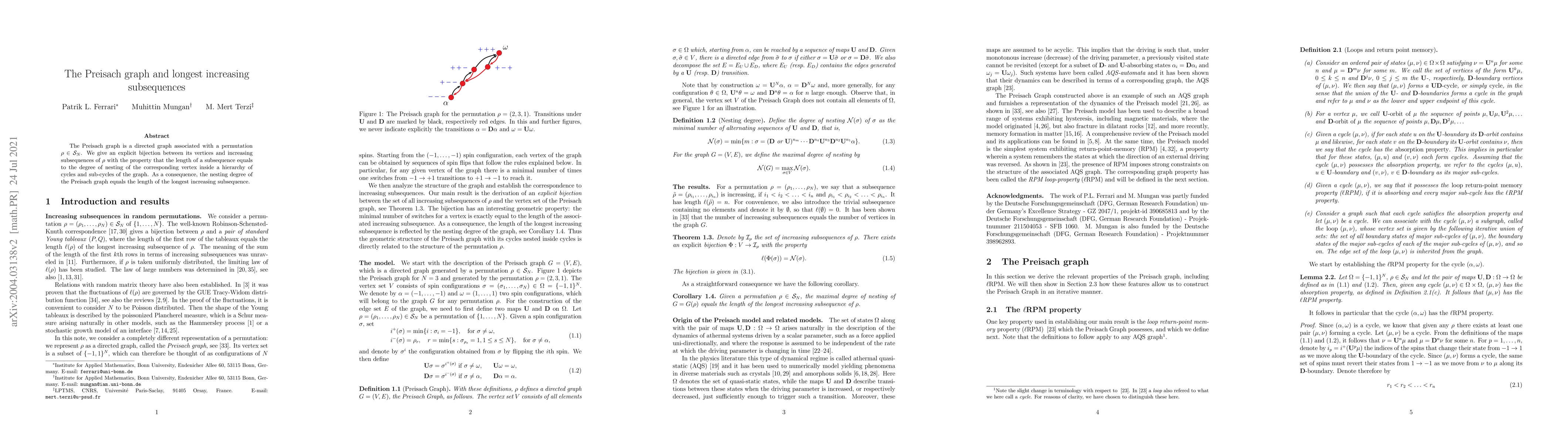 The Preisach graph provides a direct mapping between its vertices and increasing subsequences of a permutation, where the length of a subsequence corresponds to the nesting degree of the vertex. This relationship reveals that the longest increasing subsequence's length equals the nesting degree of the Preisach graph.