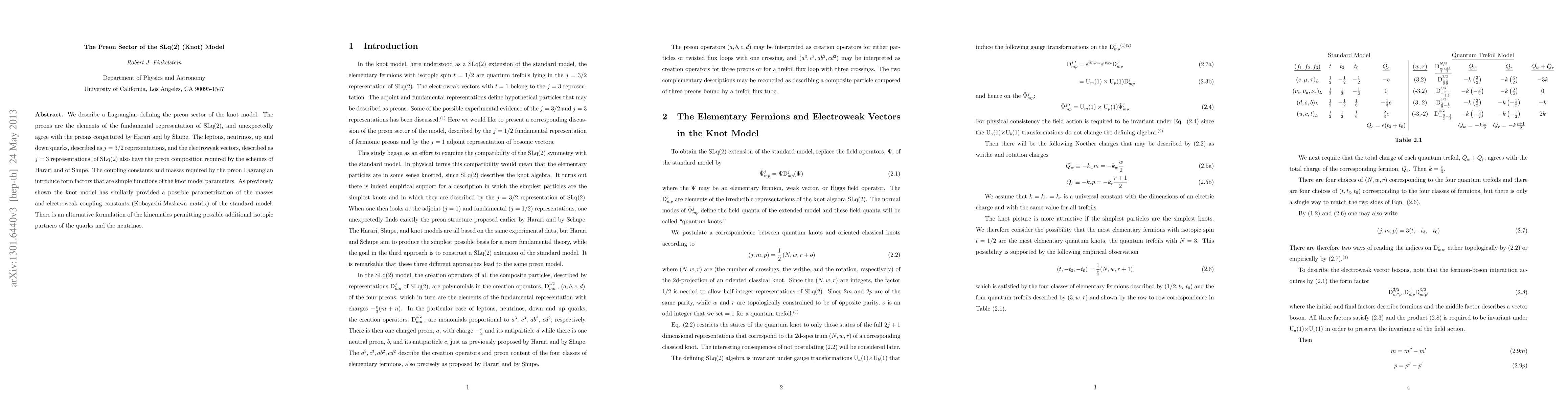 We describe a Lagrangian defining the preon sector of the knot model. The preons are the elements of the fundamental representation of SLq(2), and unexpectedly agree with the preons conjectured by Harari and by Shupe. The leptons, neutrinos, up and down quarks, described as $j=3/2$ representations, and the electroweak vectors, described as $j=3$ representations, of SLq(2) also have the preon composition required by the schemes of Harari and of Shupe. The coupling constants and masses required by the preon Lagrangian introduce form factors that are simple functions of the knot model parameters. As previously shown the knot model has similarly provided a possible parametrization of the masses and electroweak coupling constants (Kobayashi-Maskawa matrix) of the standard model. There is an alternative formulation of the kinematics permitting possible additional isotopic partners of the quarks and the neutrinos.