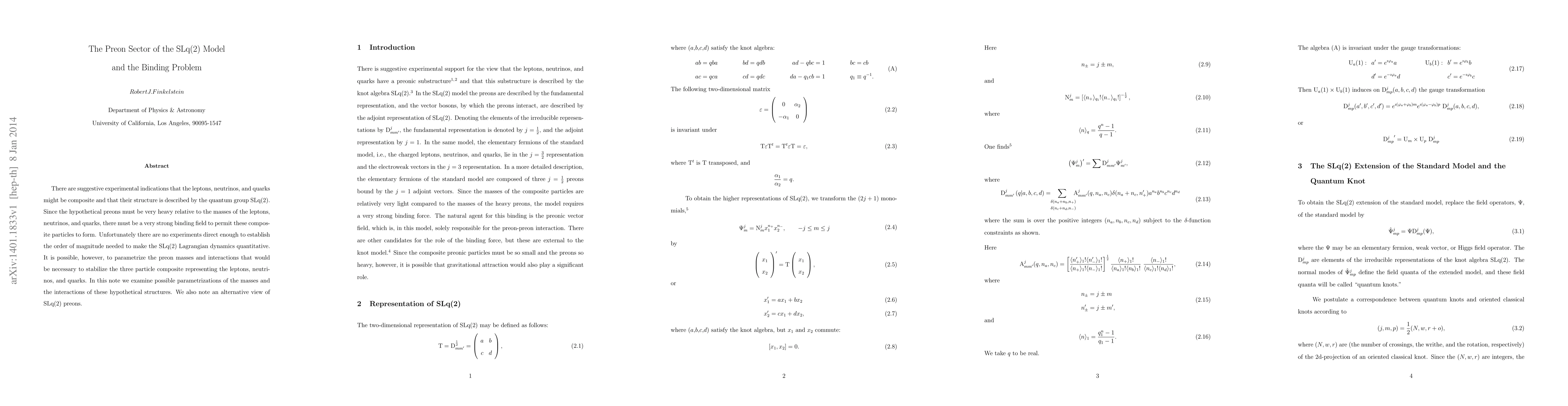 This paper explores the SLq(2) model suggesting the composite nature of leptons, neutrinos, and quarks, proposing preon structures as their constituents. It investigates the binding mechanisms required to form these composite particles, highlighting the lack of direct experimental evidence to quantify the necessary binding field.