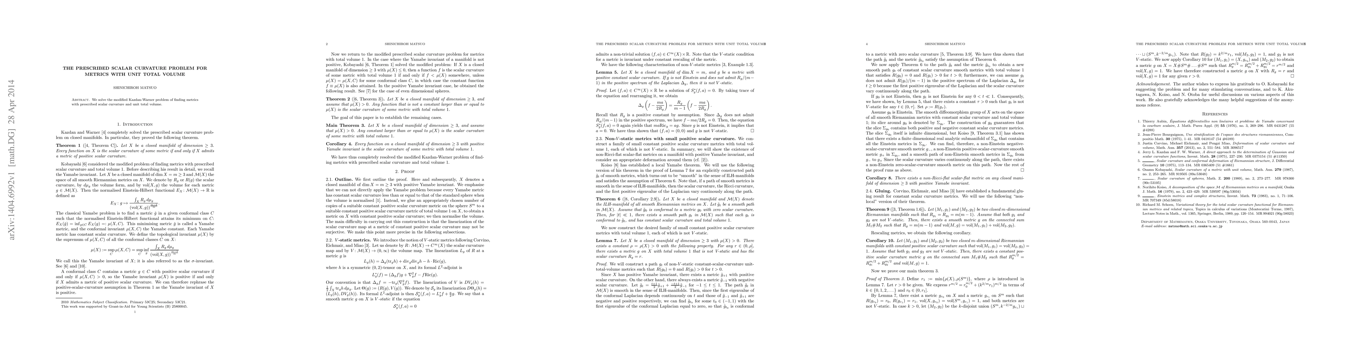 Summary: This paper addresses the modified Kazdan-Warner problem by constructing metrics with prescribed scalar curvature and a unit total volume, providing a solution to this geometric problem.