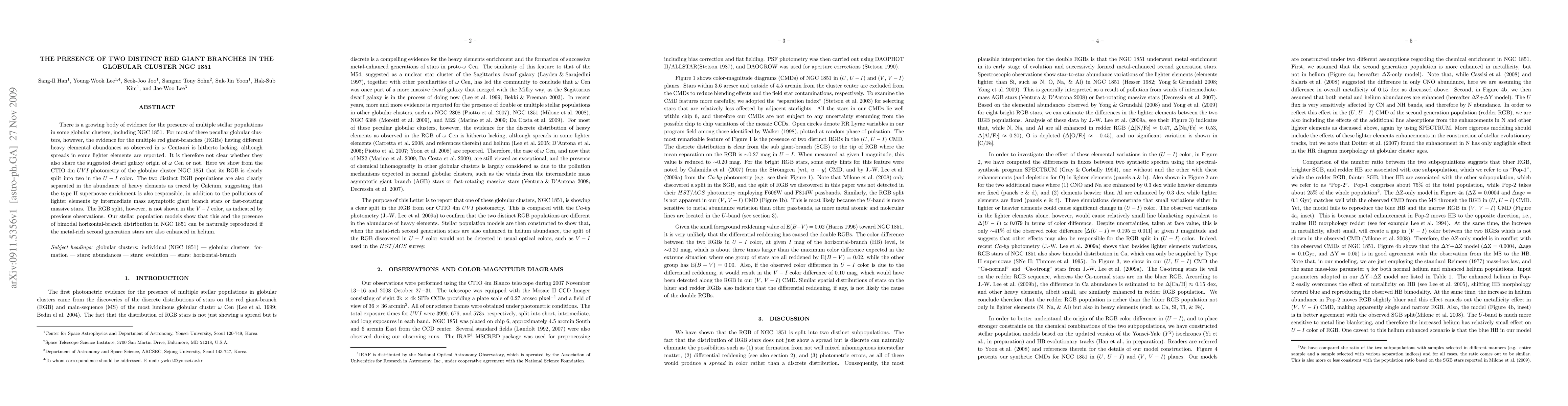 This study reveals that the globular cluster NGC 1851 exhibits two distinct red giant branches (RGBs) in UVI color, indicating different heavy elemental abundances, likely due to type II supernovae enrichment. The presence of two RGB populations and a bimodal horizontal-branch distribution suggests that metal-rich second generation stars in NGC 1851 are also enhanced in helium.