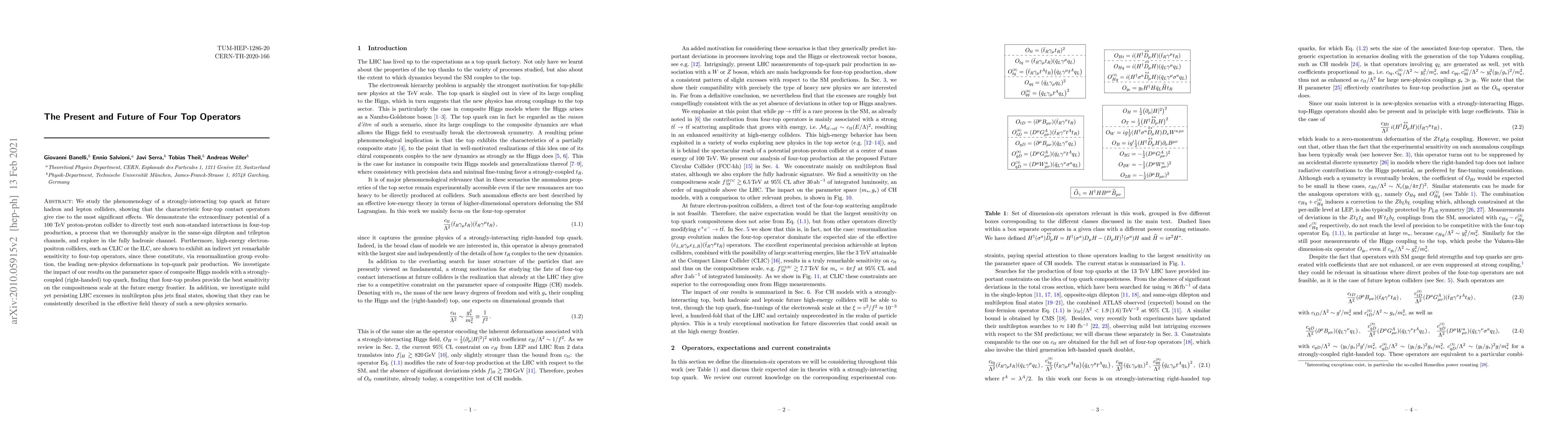 We study the phenomenology of a strongly-interacting top quark at future hadron and lepton colliders, showing that the characteristic four-top contact operators give rise to the most significant effects. We demonstrate the extraordinary potential of a 100 TeV proton-proton collider to directly test such non-standard interactions in four-top production, a process that we thoroughly analyze in the same-sign dilepton and trilepton channels, and explore in the fully hadronic channel. Furthermore, high-energy electron-positron colliders, such as CLIC or the ILC, are shown to exhibit an indirect yet remarkable sensitivity to four-top operators, since these constitute, via renormalization group evolution, the leading new-physics deformations in top-quark pair production. We investigate the impact of our results on the parameter space of composite Higgs models with a strongly-coupled (right-handed) top quark, finding that four-top probes provide the best sensitivity on the compositeness scale at the future energy frontier. In addition, we investigate mild yet persisting LHC excesses in multilepton plus jets final states, showing that they can be consistently described in the effective field theory of such a new-physics scenario.