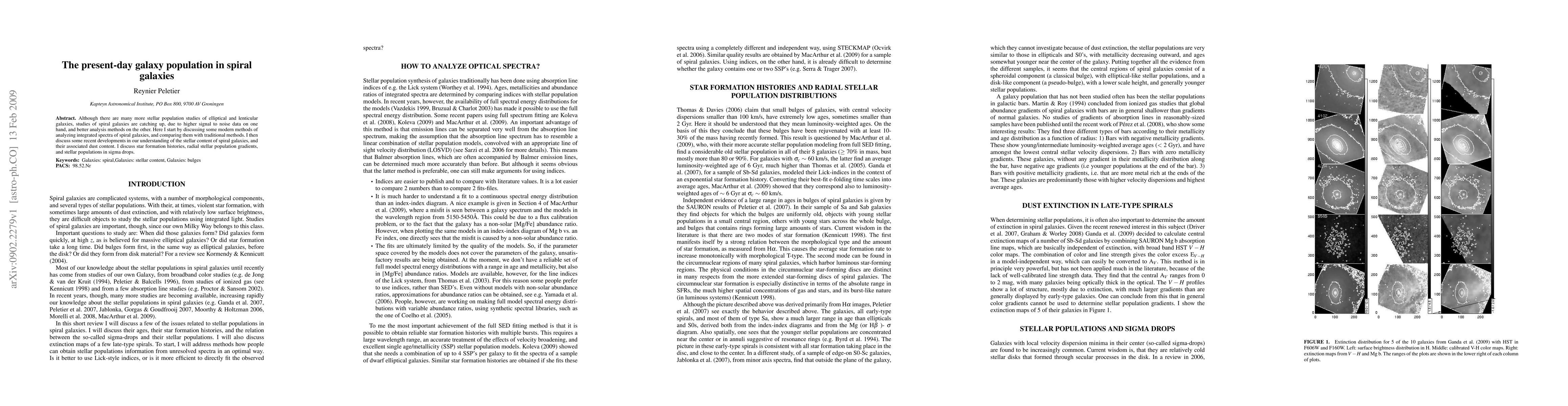 Although there are many more stellar population studies of elliptical and lenticular galaxies, studies of spiral galaxies are catching up, due to higher signal to noise data on one hand, and better analysis methods on the other. Here I start by discussing some modern methods of analyzing integrated spectra of spiral galaxies, and comparing them with traditional methods. I then discuss some recent developments in our understanding of the stellar content of spiral galaxies, and their associated dust content. I discuss star formation histories, radial stellar population gradients, and stellar populations in sigma drops.