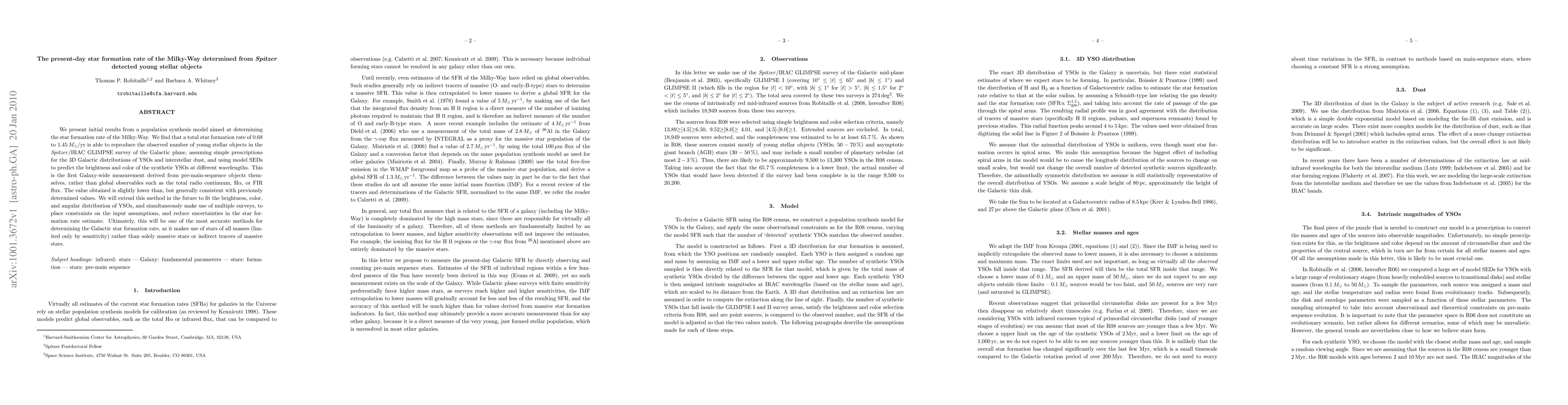 We present initial results from a population synthesis model aimed at determining the star formation rate of the Milky-Way. We find that a total star formation rate of 0.68 to 1.45 Msun/yr is able to reproduce the observed number of young stellar objects in the Spitzer/IRAC GLIMPSE survey of the Galactic plane, assuming simple prescriptions for the 3D Galactic distributions of YSOs and interstellar dust, and using model SEDs to predict the brightness and color of the synthetic YSOs at different wavelengths. This is the first Galaxy-wide measurement derived from pre-main-sequence objects themselves, rather than global observables such as the total radio continuum, Halpha, or FIR flux. The value obtained is slightly lower than, but generally consistent with previously determined values. We will extend this method in the future to fit the brightness, color, and angular distribution of YSOs, and simultaneously make use of multiple surveys, to place constraints on the input assumptions, and reduce uncertainties in the star formation rate estimate. Ultimately, this will be one of the most accurate methods for determining the Galactic star formation rate, as it makes use of stars of all masses (limited only by sensitivity) rather than solely massive stars or indirect tracers of massive stars.
