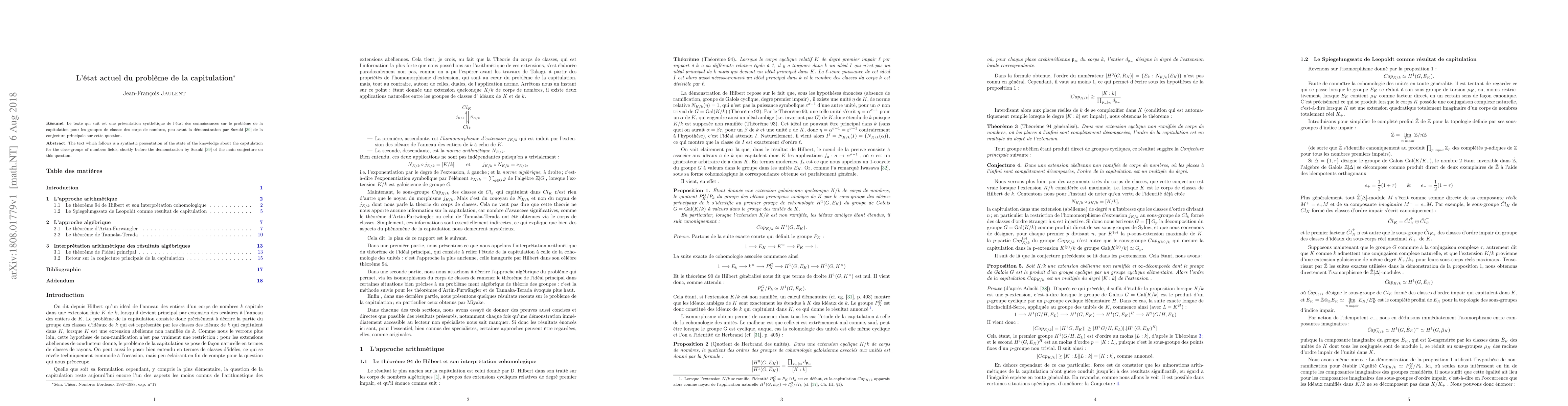 The text is a synthetic presentation of the state of the knowledge about the capitulation for the class-groups of numbers fields, shortly before the demonstration by Suzuki of the main conjecture on this question.