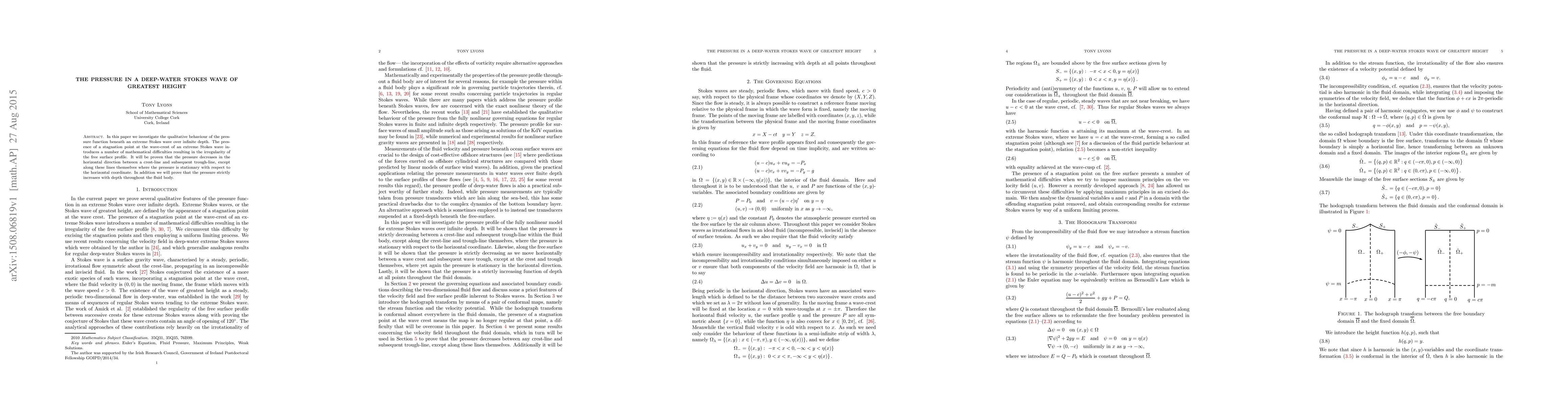 This paper examines the pressure distribution beneath an extreme Stokes wave in deep water, proving that pressure decreases horizontally between crests and troughs, while strictly increasing with depth. The study addresses mathematical complexities arising from the wave's irregular profile due to a stagnation point at the crest.