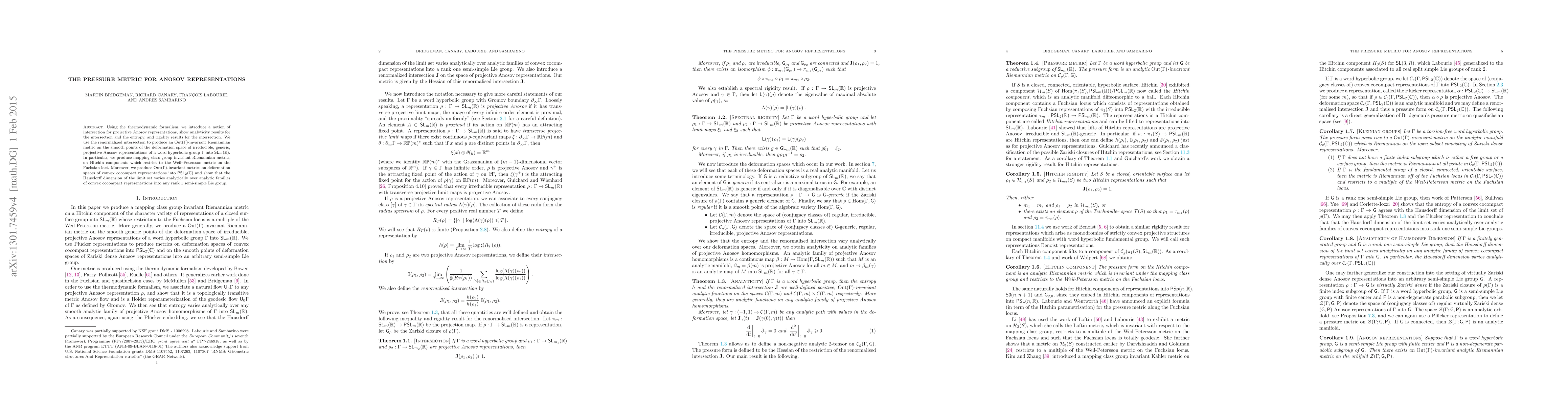 Using the thermodynamics formalism, we introduce a notion of intersection for projective Anosov representations, show analyticity results for the intersection and the entropy, and rigidity results for the intersection. We use the renormalized intersection to produce a $Out(\Gamma)$-invariant Riemannian metric on the smooth points of the deformation space of irreducible, projective Anosov representations of a word hyperbolic group $\Gamma$ into $SL(m,R)$ whose Zariski closure contains a generic element. In particular, we produce mapping class group invariant Riemannian metrics on Hitchin components which restrict to the Weil--Petersson metric on the Fuchsian loci. Moreover, we produce $Out(\Gamma)$-invariant metrics on deformation spaces of convex cocompact representations into $PSL(2,C)$ and show that the Hausdorff dimension of the limit set varies analytically over analytic families of convex cocompact representations into any rank 1 semi-simple Lie group.