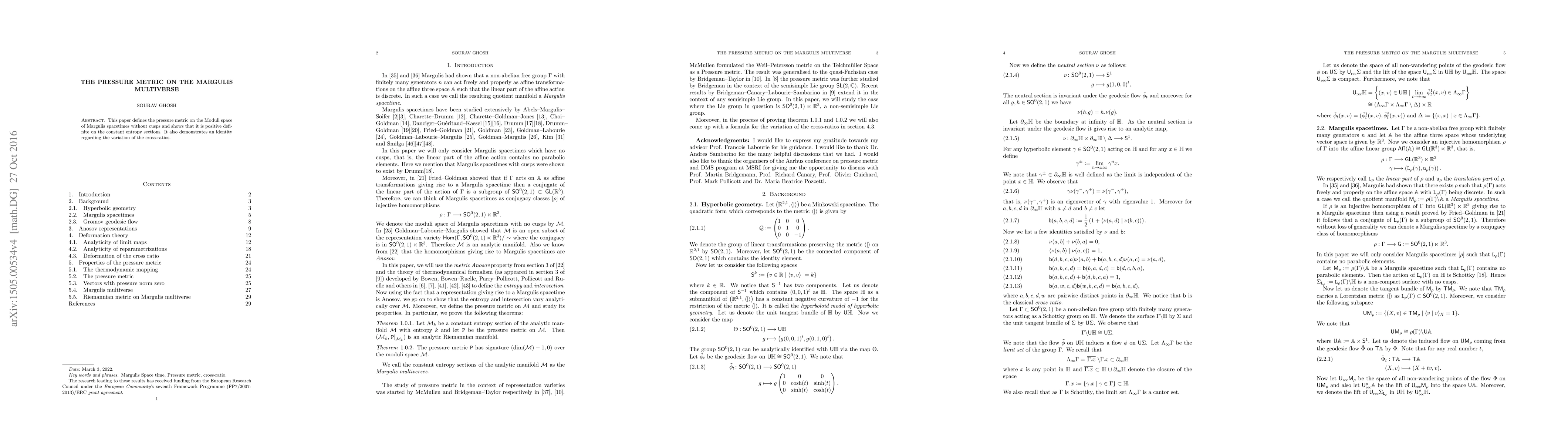 This paper defines the pressure metric on the Moduli space of Margulis spacetimes without cusps and shows that it is positive definite on the constant entropy sections. It also demonstrates an identity regarding the variation of the cross-ratios.