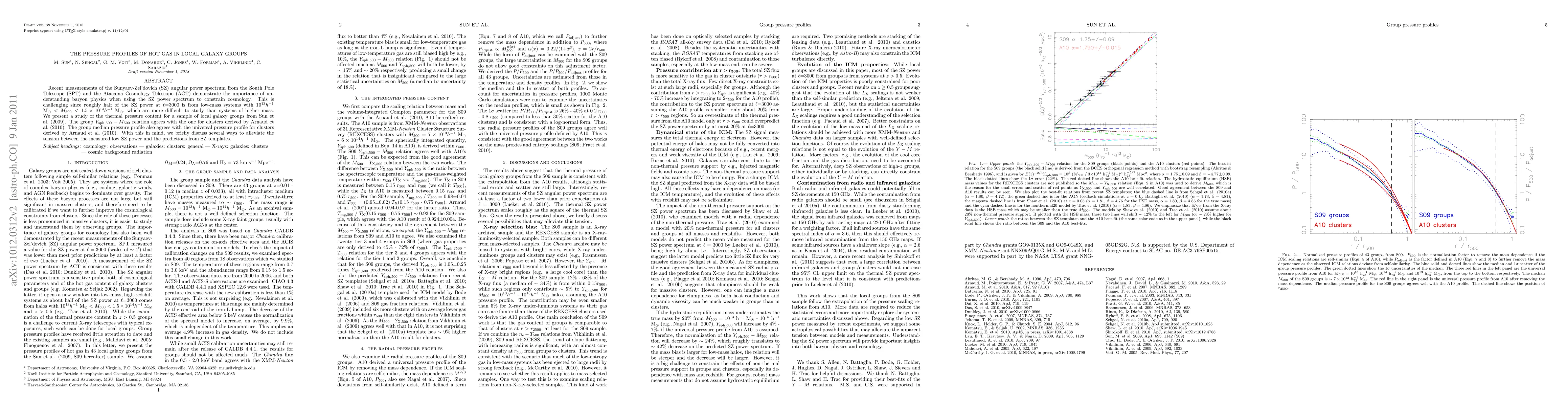 Recent measurements of the Sunyaev-Zel'dovich (SZ) angular power spectrum from the South Pole Telescope (SPT) and the Atacama Cosmology Telescope (ACT) demonstrate the importance of understanding baryon physics when using the SZ power spectrum to constrain cosmology. This is challenging since roughly half of the SZ power at l=3000 is from low-mass systems with 10^13 h^-1 M_sun < M_500 < 1.5x10^14 h^-1 M_sun, which are more difficult to study than systems of higher mass. We present a study of the thermal pressure content for a sample of local galaxy groups from Sun et al. (2009). The group Y_{sph, 500} - M_500 relation agrees with the one for clusters derived by Arnaud et al. (2010). The group median pressure profile also agrees with the universal pressure profile for clusters derived by Arnaud et al. (2010). With this in mind, we briefly discuss several ways to alleviate the tension between the measured low SZ power and the predictions from SZ templates.
