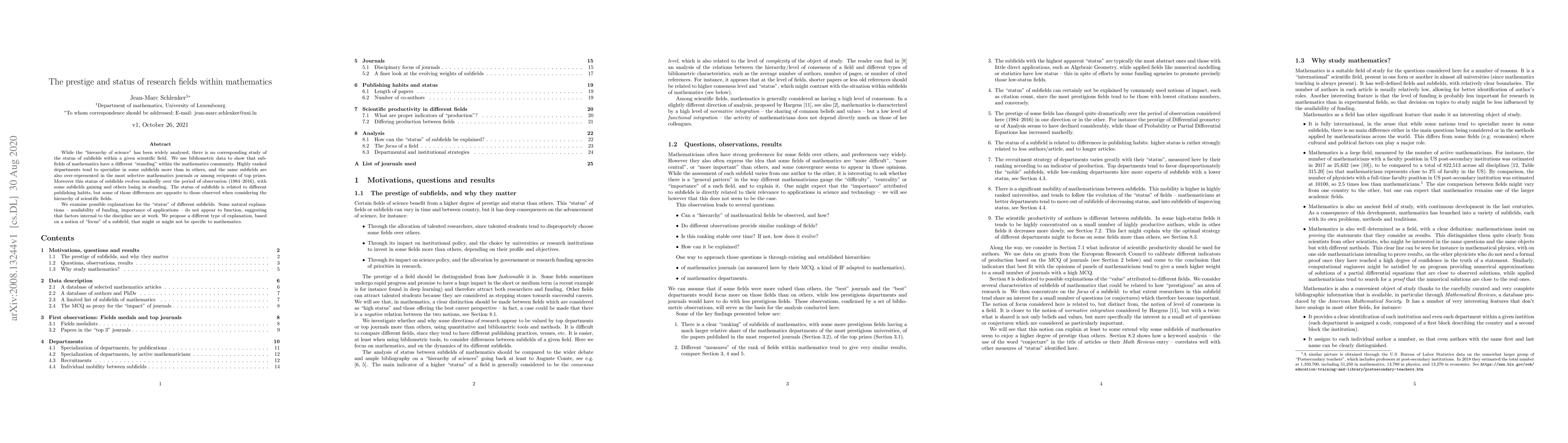 While the ``hierarchy of science'' has been widely analysed, there is no corresponding study of the status of subfields within a given scientific field. We use bibliometric data to show that subfields of mathematics have a different ``standing'' within the mathematics community. Highly ranked departments tend to specialize in some subfields more than in others, and the same subfields are also over-represented in the most selective mathematics journals or among recipients of top prizes. Moreover this status of subfields evolves markedly over the period of observation (1984--2016), with some subfields gaining and others losing in standing. The status of subfields is related to different publishing habits, but some of those differences are opposite to those observed when considering the hierarchy of scientific fields. We examine possible explanations for the ``status'' of different subfields. Some natural explanations -- availability of funding, importance of applications -- do not appear to function, suggesting that factors internal to the discipline are at work. We propose a different type of explanation, based on a notion of ``focus'' of a subfield, that might or might not be specific to mathematics.