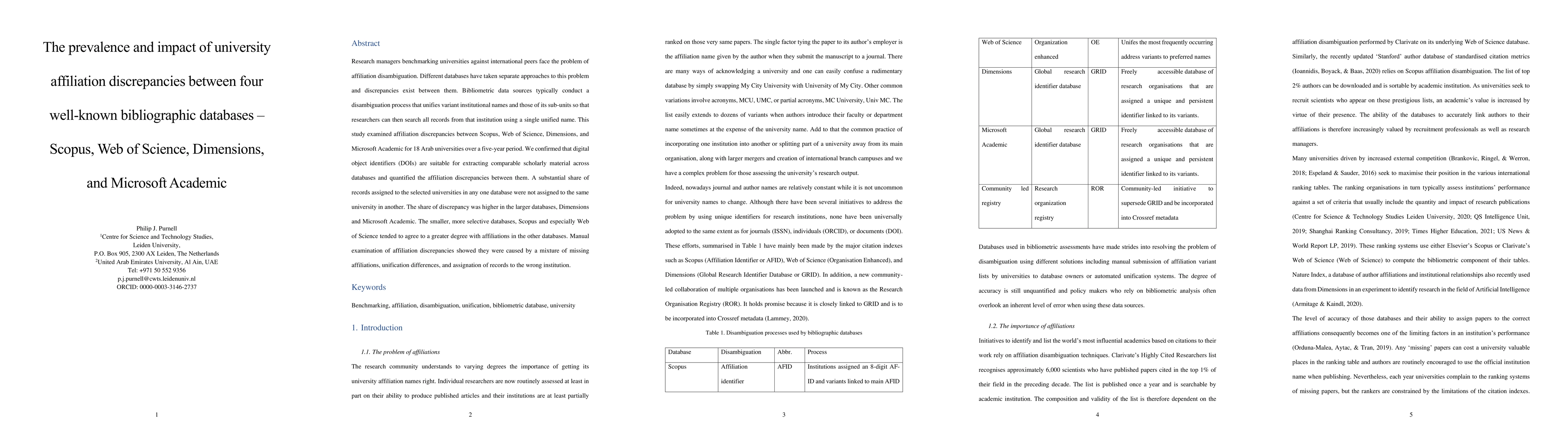 This study investigates affiliation discrepancies among four bibliographic databases—Scopus, Web of Science, Dimensions, and Microsoft Academic—for 18 Arab universities. It found significant discrepancies in affiliation assignments, with larger databases showing more inconsistencies, while smaller, selective databases had more agreement.
