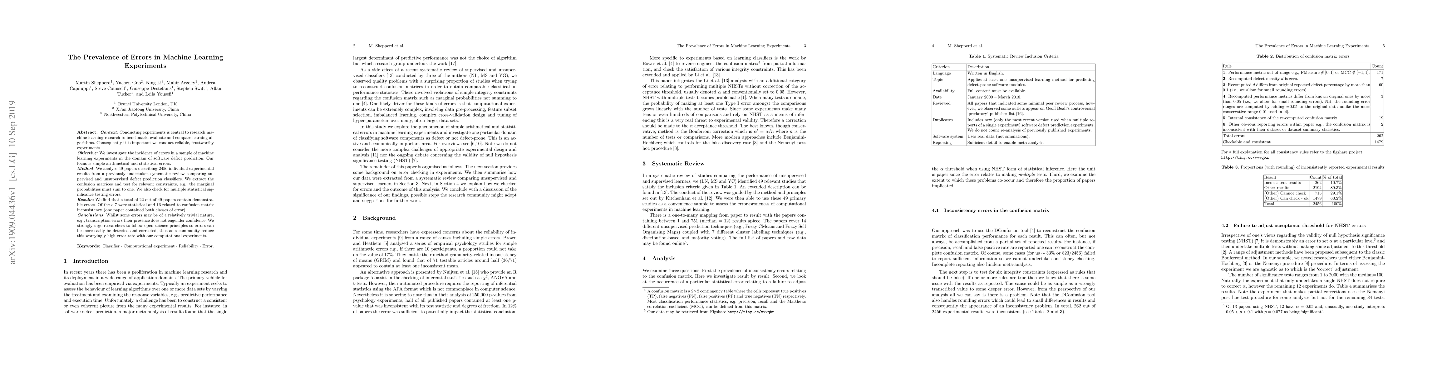 Context: Conducting experiments is central to research machine learning research to benchmark, evaluate and compare learning algorithms. Consequently it is important we conduct reliable, trustworthy experiments. Objective: We investigate the incidence of errors in a sample of machine learning experiments in the domain of software defect prediction. Our focus is simple arithmetical and statistical errors. Method: We analyse 49 papers describing 2456 individual experimental results from a previously undertaken systematic review comparing supervised and unsupervised defect prediction classifiers. We extract the confusion matrices and test for relevant constraints, e.g., the marginal probabilities must sum to one. We also check for multiple statistical significance testing errors. Results: We find that a total of 22 out of 49 papers contain demonstrable errors. Of these 7 were statistical and 16 related to confusion matrix inconsistency (one paper contained both classes of error). Conclusions: Whilst some errors may be of a relatively trivial nature, e.g., transcription errors their presence does not engender confidence. We strongly urge researchers to follow open science principles so errors can be more easily be detected and corrected, thus as a community reduce this worryingly high error rate with our computational experiments.