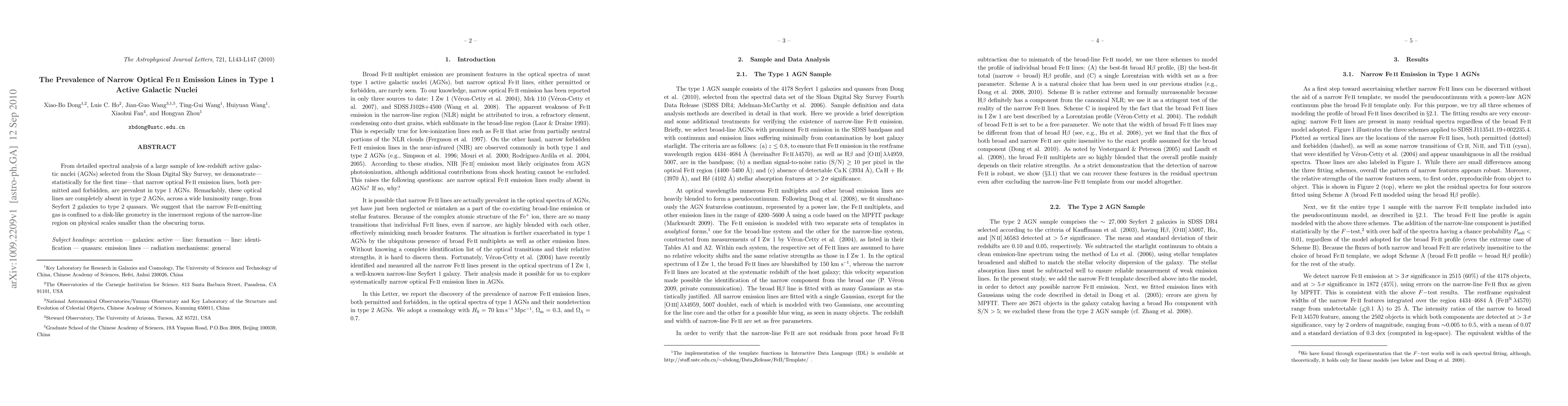 From detailed spectral analysis of a large sample of low-redshift active galactic nuclei (AGNs) selected from the Sloan Digital Sky Survey, we demonstrate---statistically for the first time---that narrow optical Fe II emission lines, both permitted and forbidden, are prevalent in type 1 AGNs. Remarkably, these optical lines are completely absent in type 2 AGNs, across a wide luminosity range, from Seyfert 2 galaxies to type 2 quasars. We suggest that the narrow FeII-emitting gas is confined to a disk-like geometry in the innermost regions of the narrow-line region on physical scales smaller than the obscuring torus.