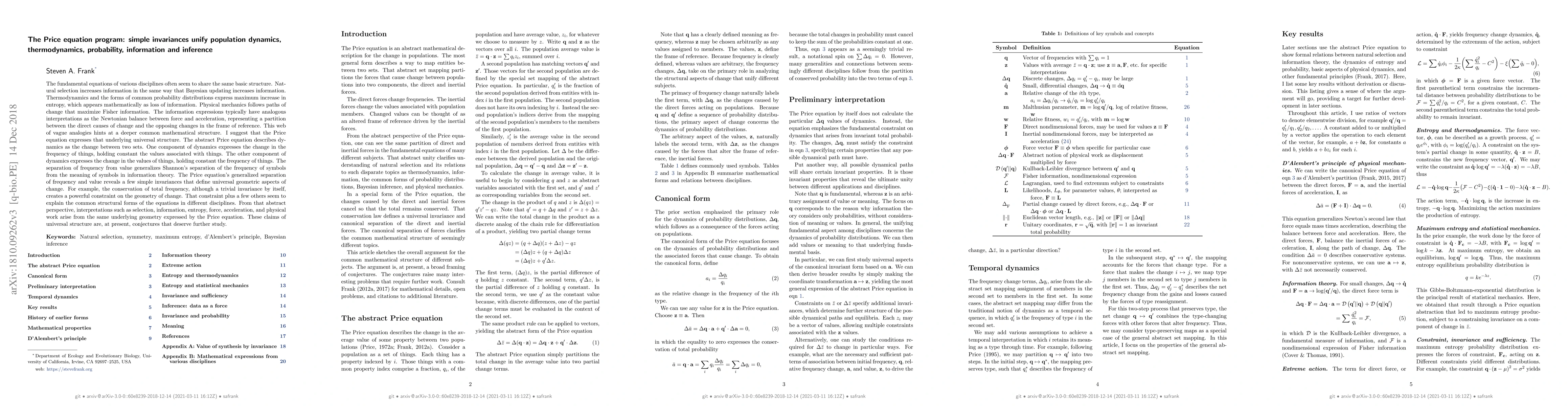 The fundamental equations of various disciplines often seem to share the same basic structure. Natural selection increases information in the same way that Bayesian updating increases information. Thermodynamics and the forms of common probability distributions express maximum increase in entropy, which appears mathematically as loss of information. Physical mechanics follows paths of change that maximize Fisher information. The information expressions typically have analogous interpretations as the Newtonian balance between force and acceleration, representing a partition between direct causes of change and opposing changes in the frame of reference. This web of vague analogies hints at a deeper common mathematical structure. I suggest that the Price equation expresses that underlying universal structure. The abstract Price equation describes dynamics as the change between two sets. One component of dynamics expresses the change in the frequency of things, holding constant the values associated with things. The other component of dynamics expresses the change in the values of things, holding constant the frequency of things. The separation of frequency from value generalizes Shannon's separation of the frequency of symbols from the meaning of symbols in information theory. The Price equation's generalized separation of frequency and value reveals a few simple invariances that define universal geometric aspects of change. For example, the conservation of total frequency, although a trivial invariance by itself, creates a powerful constraint on the geometry of change. That constraint plus a few others seem to explain the common structural forms of the equations in different disciplines. From that abstract perspective, interpretations such as selection, information, entropy, force, acceleration, and physical work arise from the same underlying geometry expressed by the Price equation.