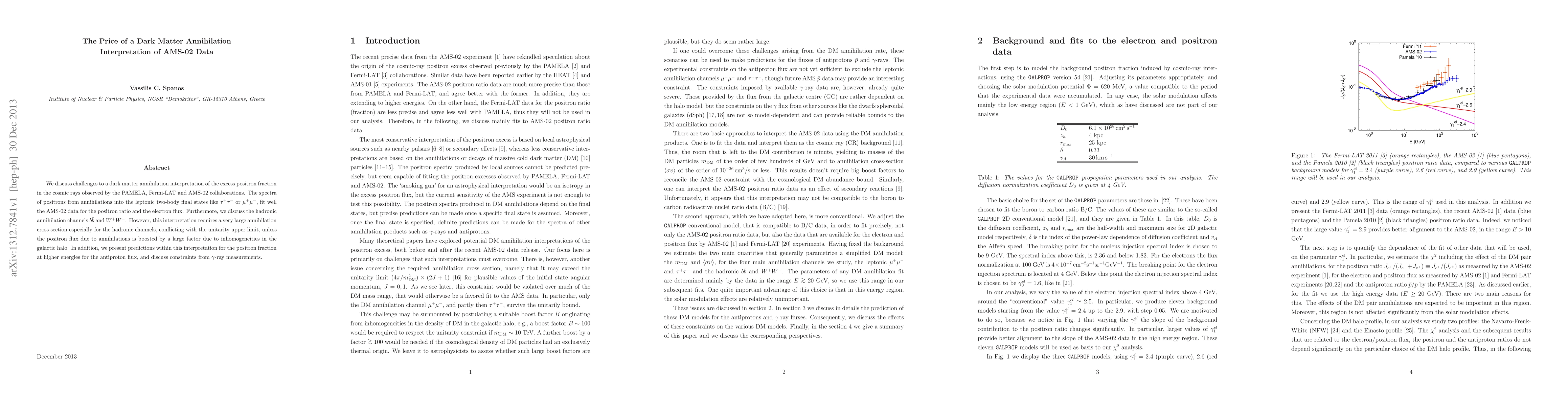 This paper examines the challenges of interpreting the excess positron fraction in cosmic rays observed by PAMELA, Fermi-LAT, and AMS-02 as a result of dark matter annihilation. While leptonic annihilation channels fit AMS-02 data well, hadronic channels require a large annihilation cross section, conflicting with unitarity limits, suggesting a need for significant flux boosting due to galactic halo inhomogeneities.